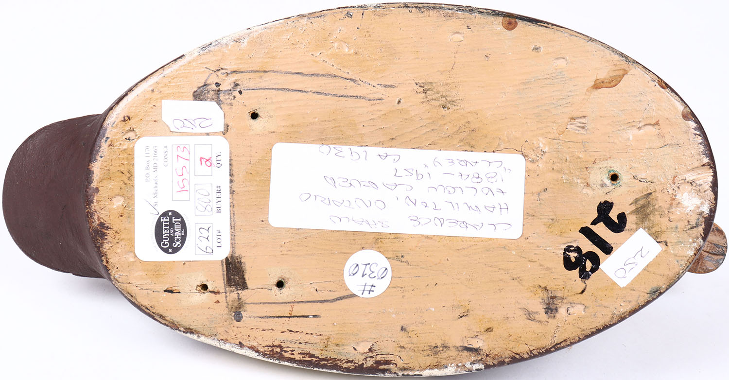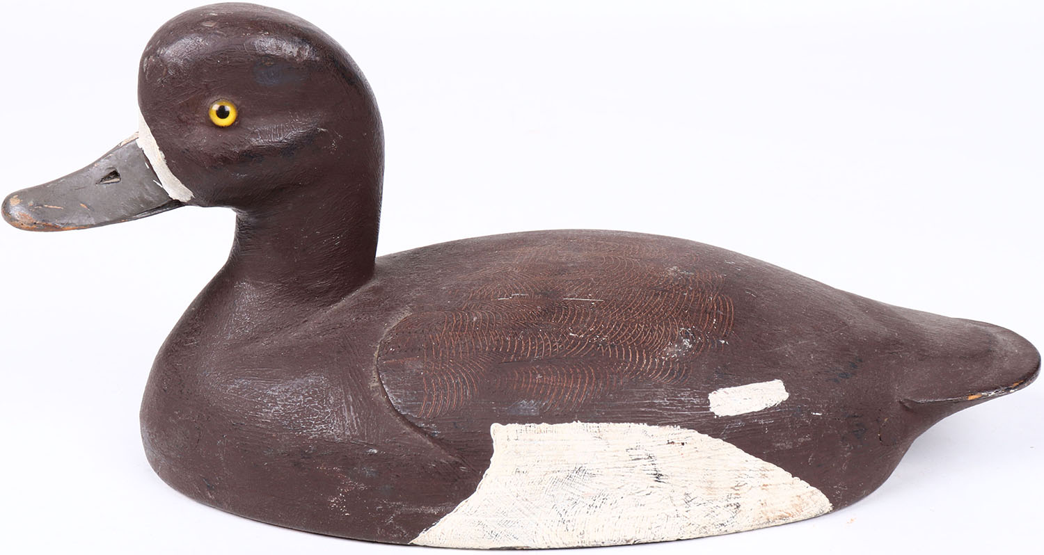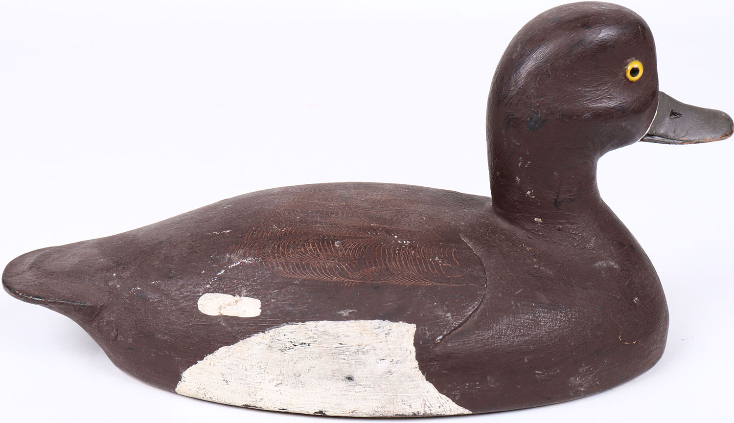 Bluebill Hen by Clarence Shaw, Hamilton, Ontario, glass eyes, hollow wood, repainted, comb painting, signed on bottom, structurally excellent. Grade: Excellent ++ - Value: 50 to 100