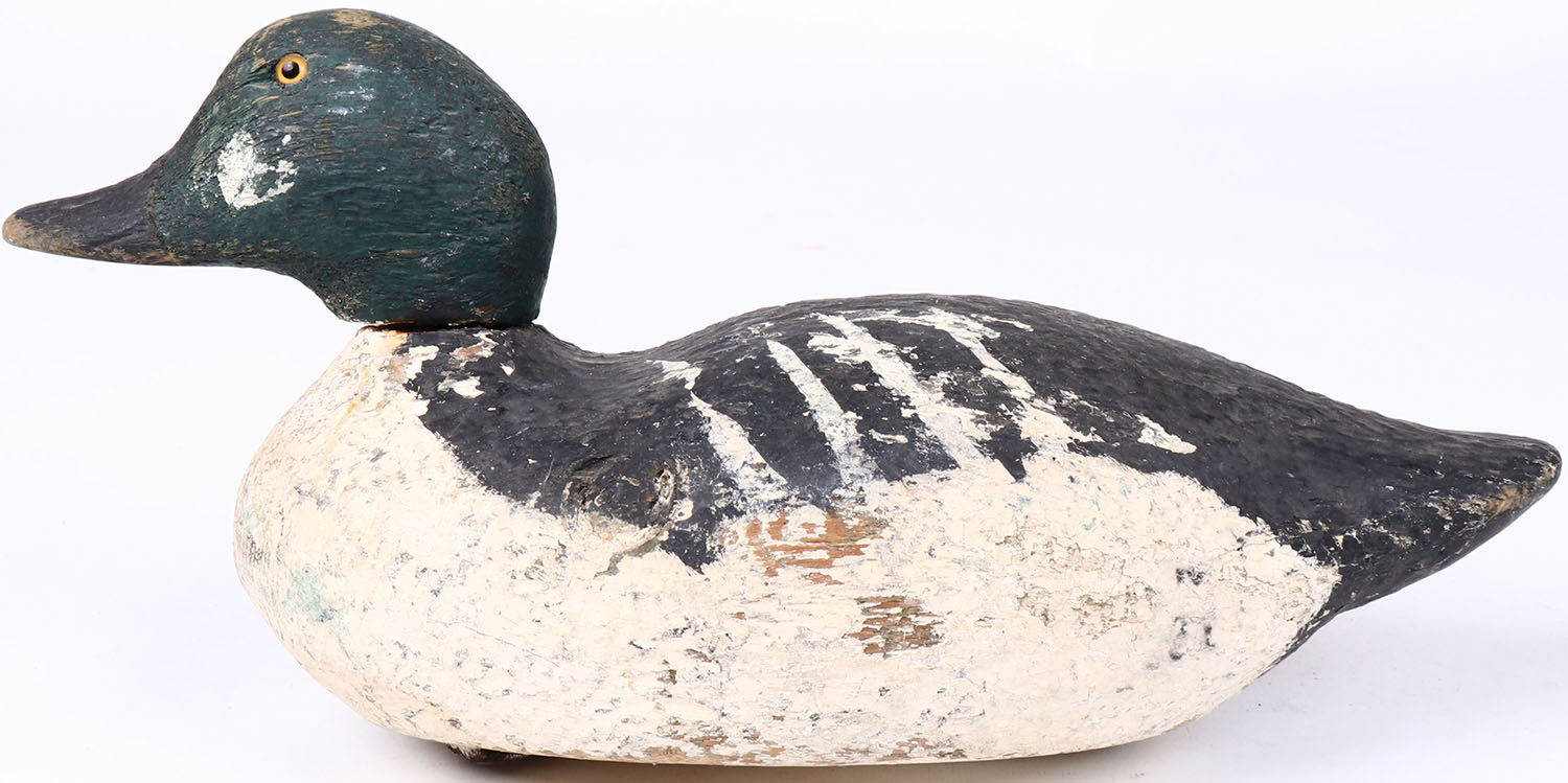 Goldeneye Drake appears to be Gundelfinger Factory, glass eyes, solid wood, original paint, has age crack on back.