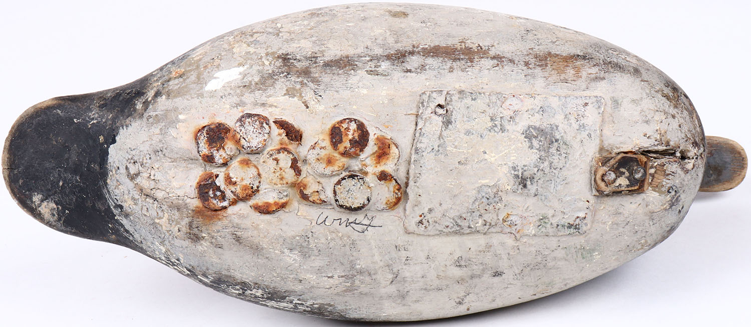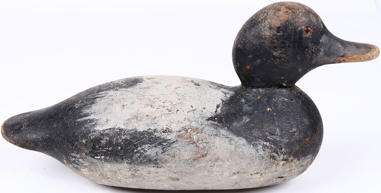 Bluebill Drake by Mason Decoy Company, glass eyes, solid wood, original paint with typical wear, has age cracks on back. Grade: Excellent - Value: 40 to 80
