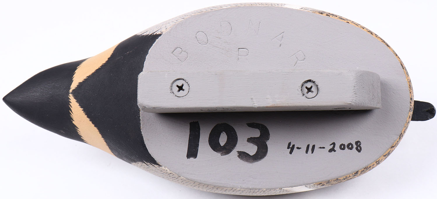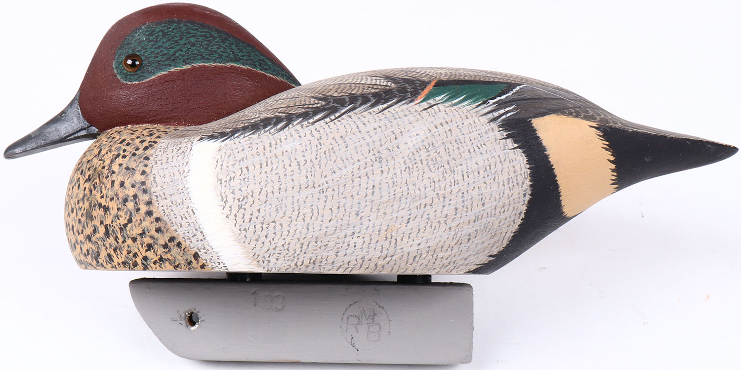 Green Wing Teal Drake by Bodnar, glass eyes, solid wood, orignal paint with beautiful feather detail, structurally excellent, branded BODNAR and RMB on bottom. Grade: MINT - Value: 50 to 100