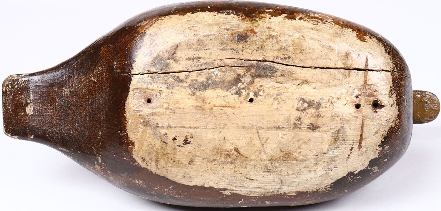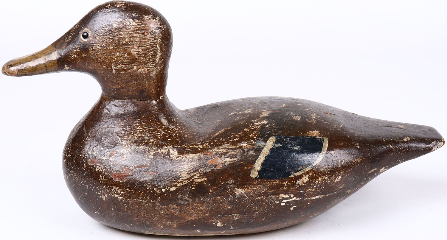 Black Duck by unknown maker, glass eyes, solid wood, original paint, has age crack on bottom. Grade: Excellent - Value: 50 to 100