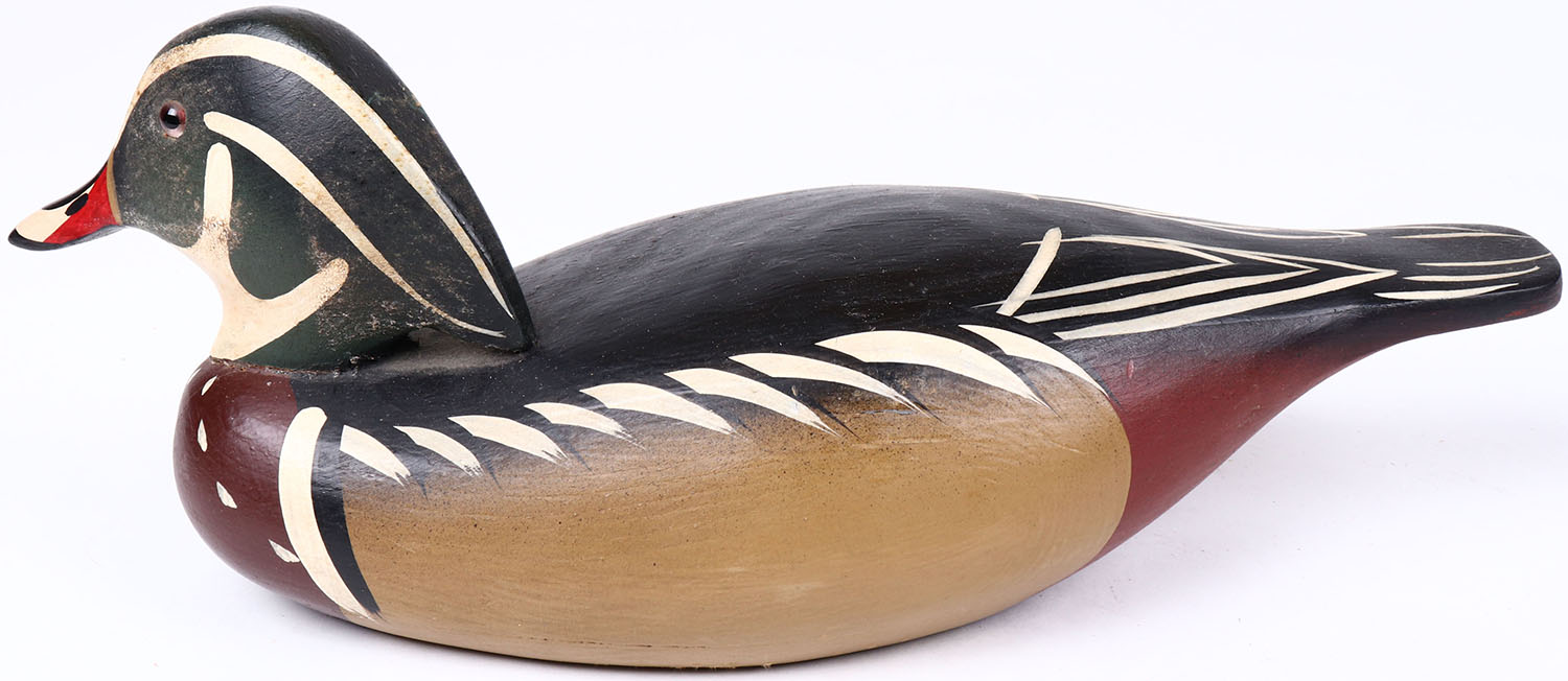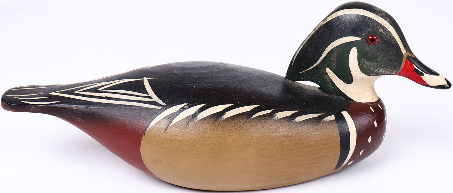 Wood Duck by unknown maker, glass eyes, hollow wood, original paint, structurally excellent. Grade: Excellent ++ - Value: 40 to 80