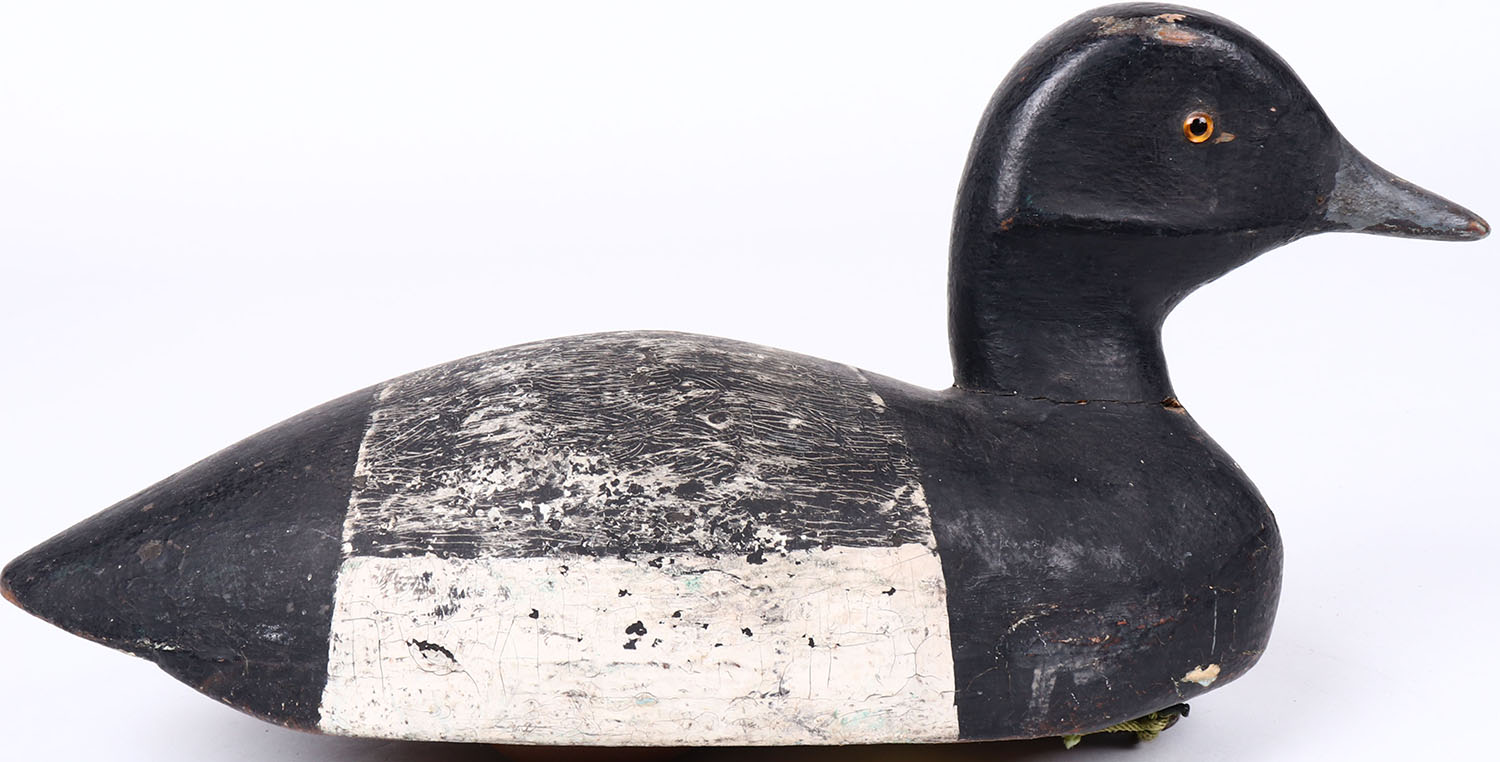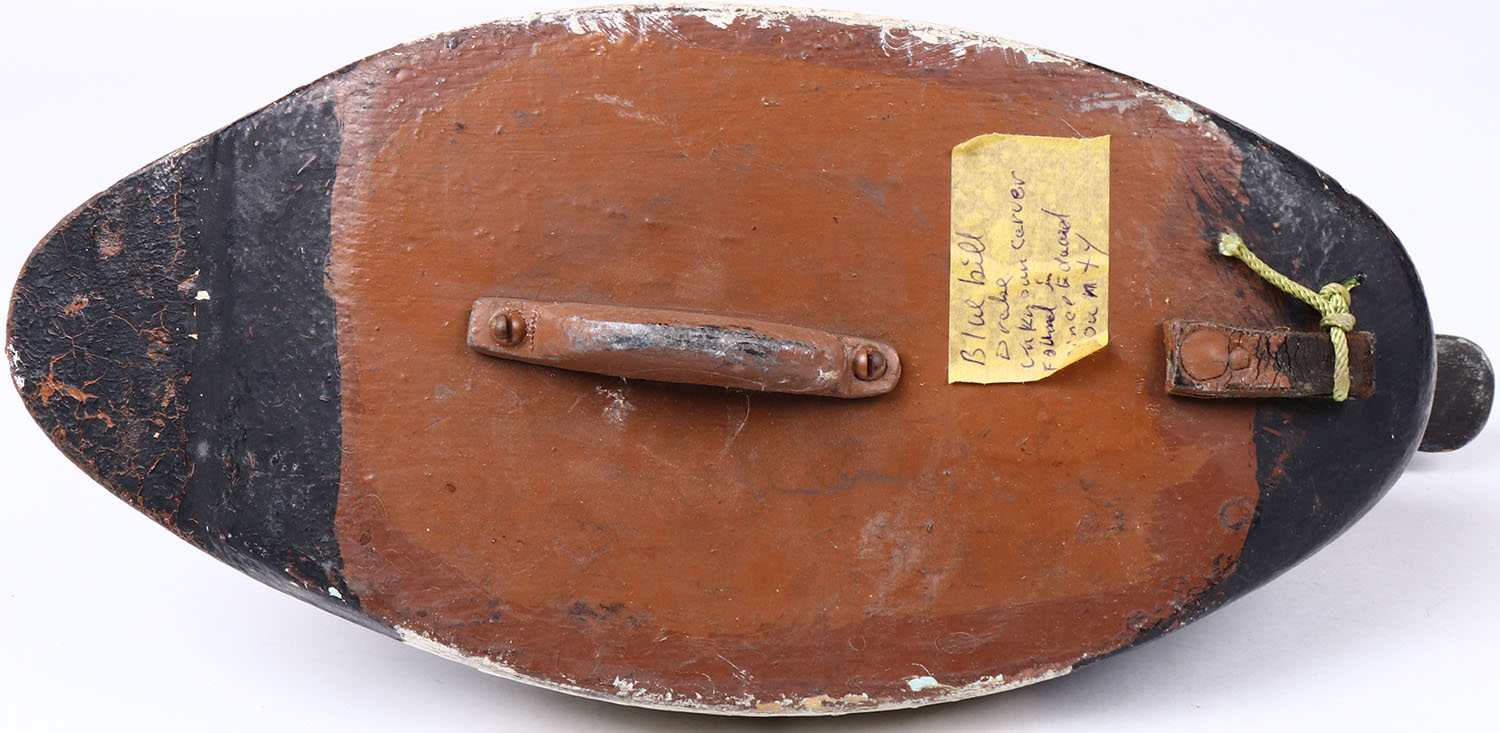 Bluebill Drake by unknown maker, glass eyes, solid wood, original paint with comb painting, structurally excellent. Grade: Excellent + - Value: 50 to 100