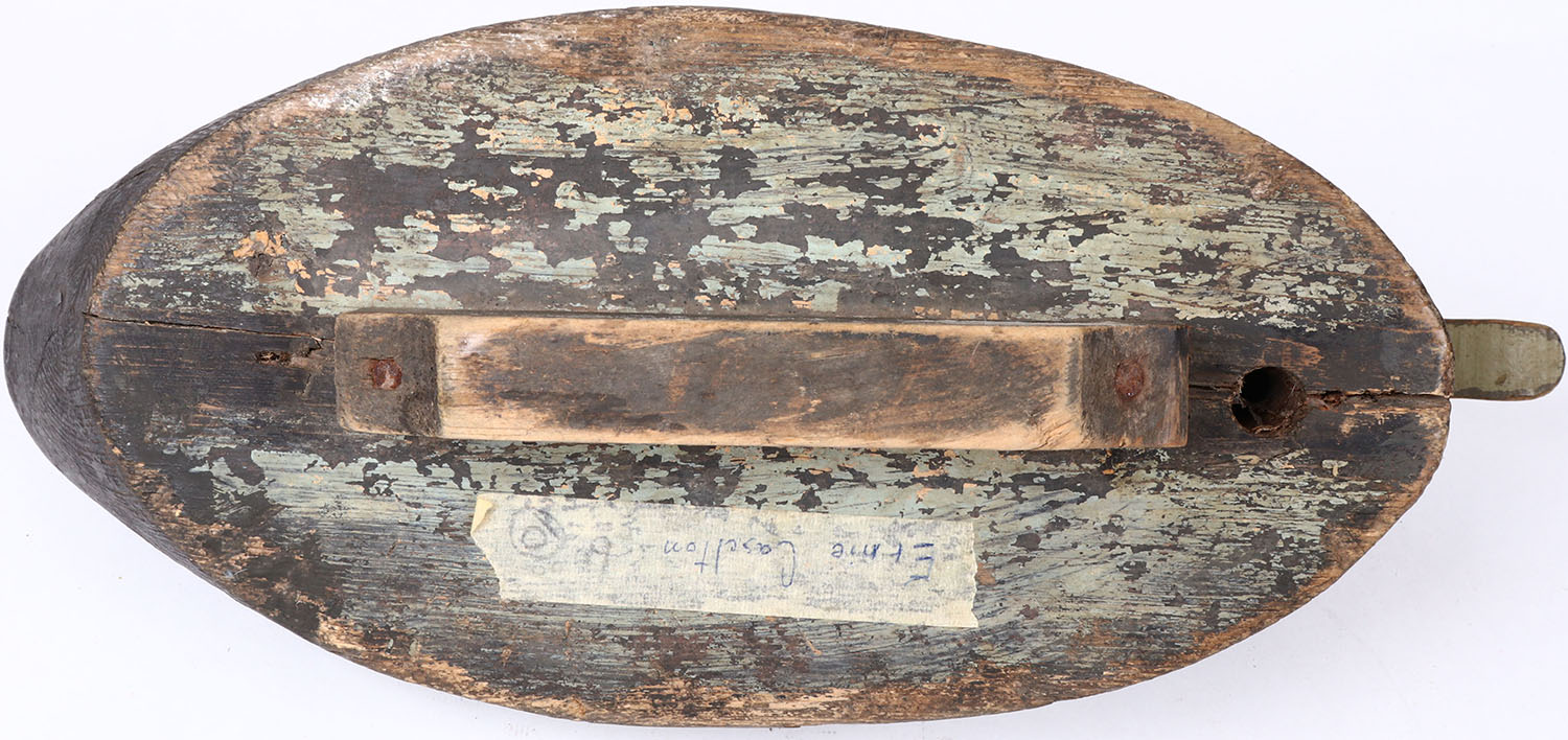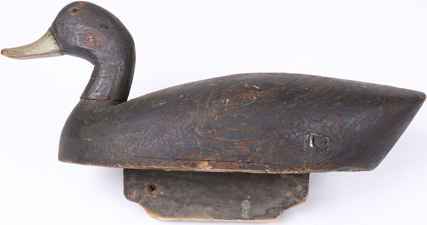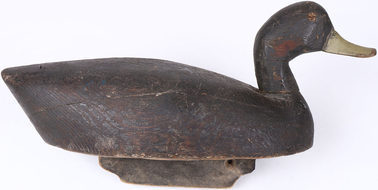 Black Duck by Ernie Caselton, glass eyes, hollow wood, original paint, has age crack on back , under neck and on bottom, signed on bottom. Grade: Excellent - Value: 70 to 150