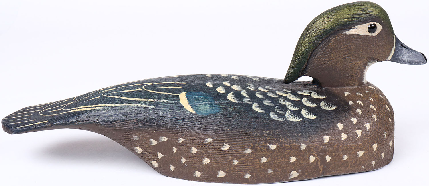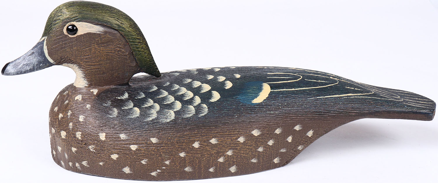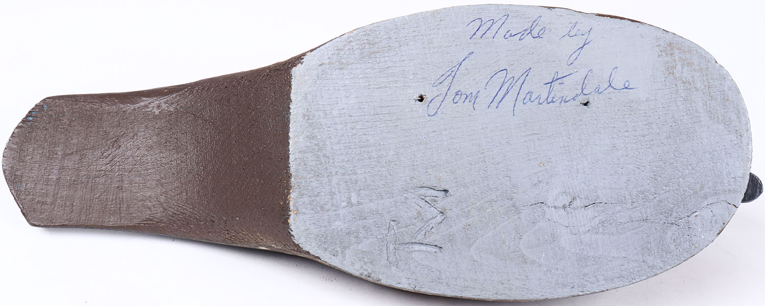 Wood Duck Hen by Tom Martindale, Ontario, Canada, glass eyes, hollow wood, original paint, structurally excellent, signed and branded on bottom. Grade: MINT - Value: 70 to 150