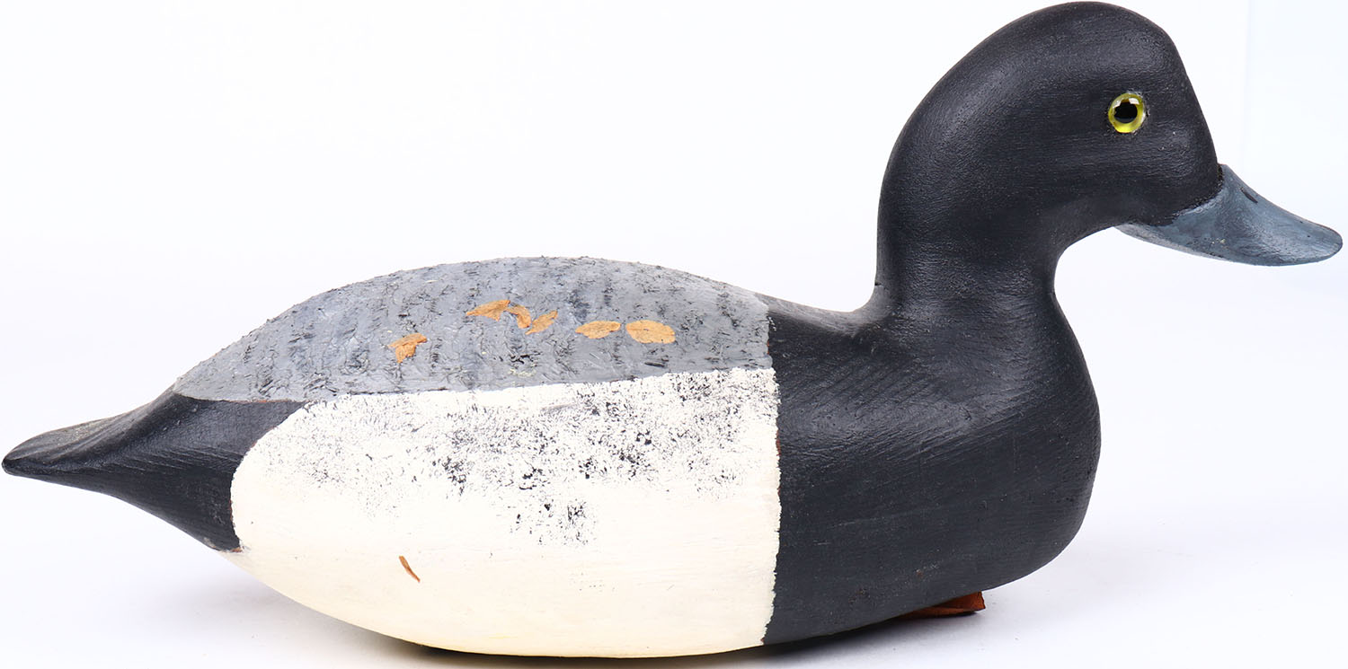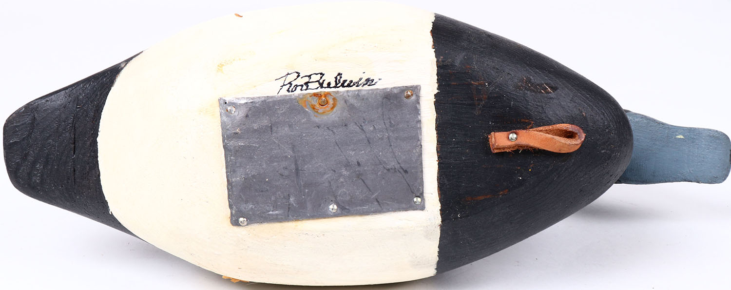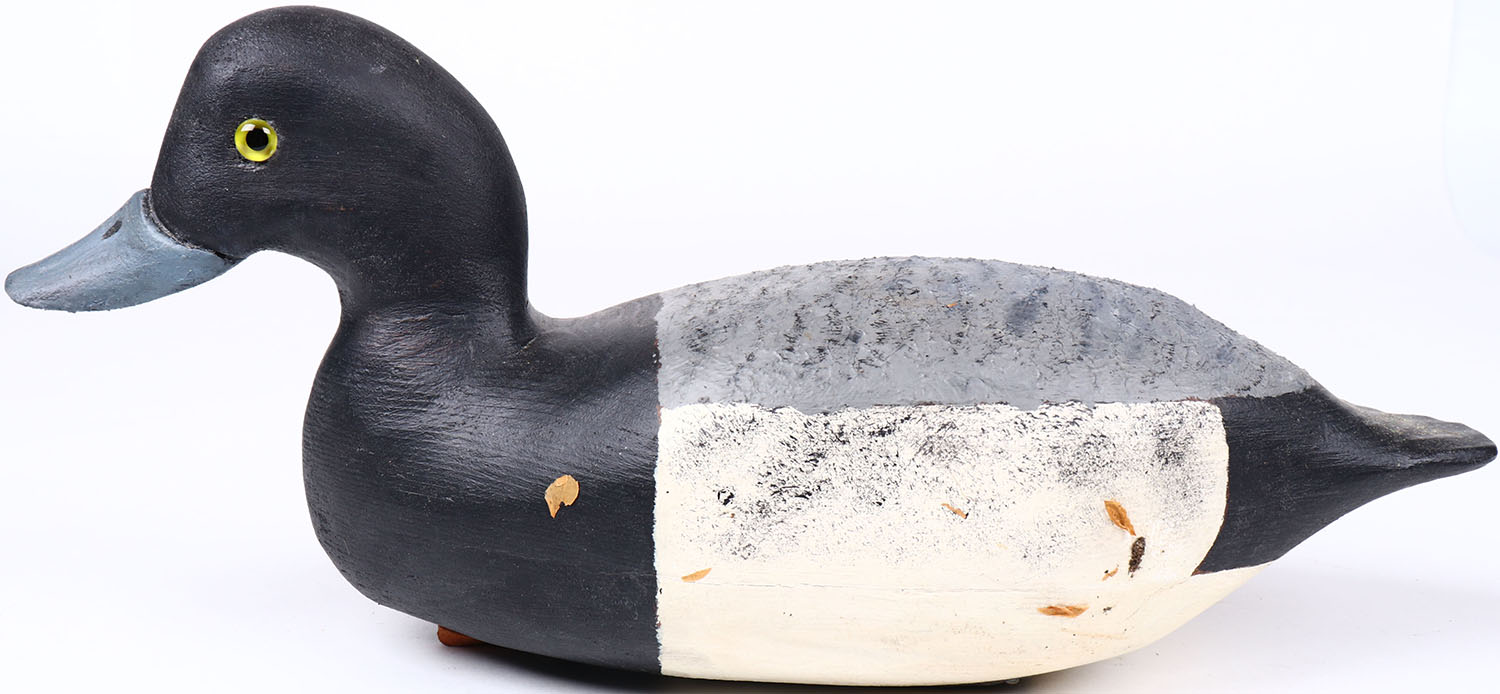Bluebill Drake by Ron Blevin, glass eyes, hollow wood, original paint, structurally excellent, signed on bottom. Grade: Excellent + - Value: 40 to 80