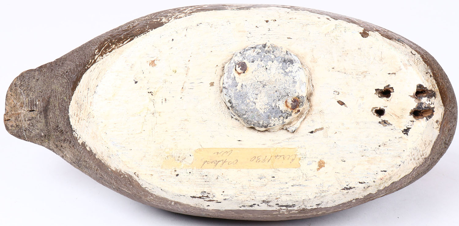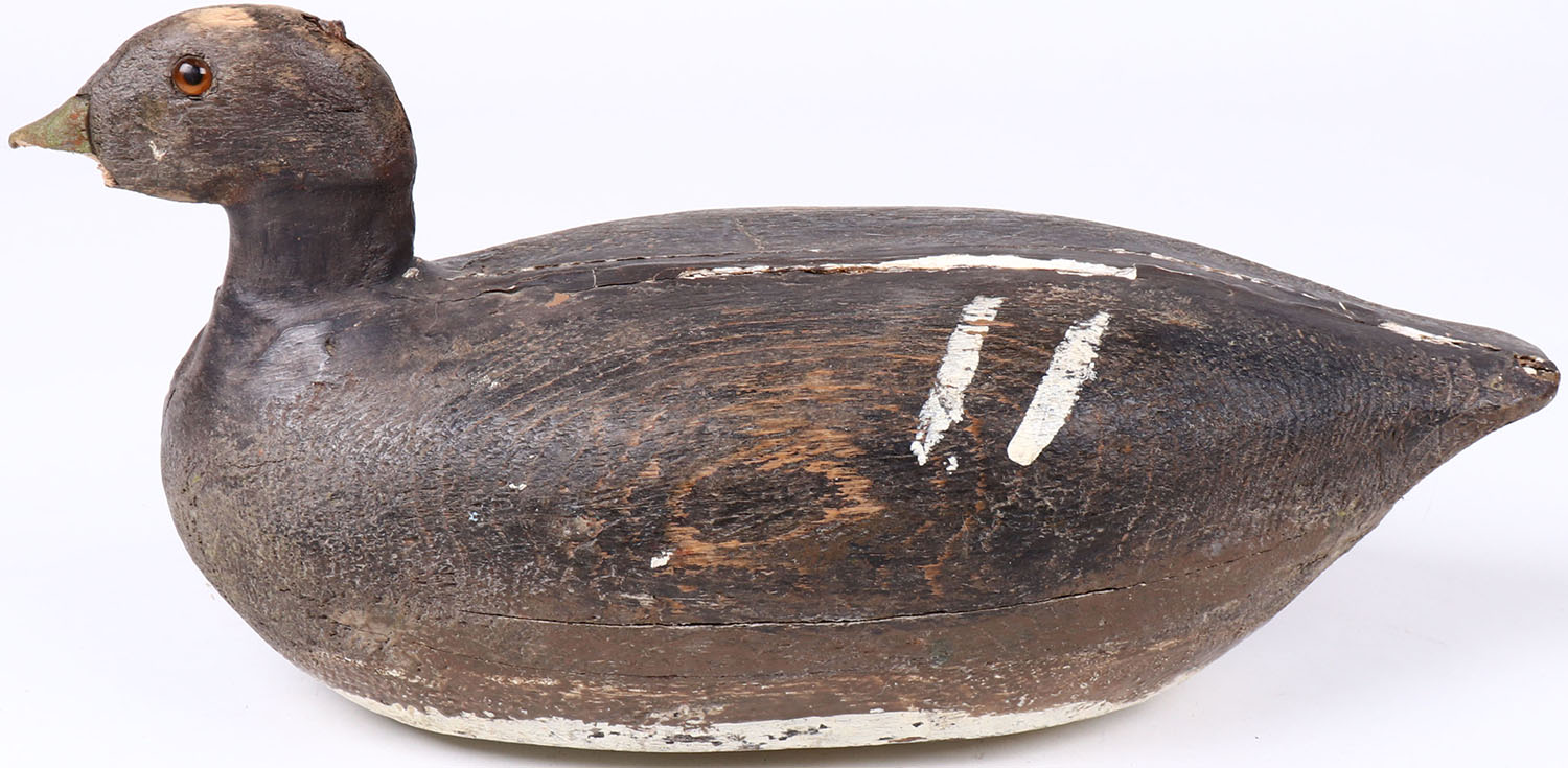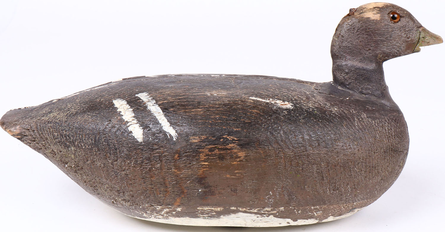 Black Duck by unknown maker, glass eyes, solid wood, has age cracks on back, bill is broken. Grade: Very Good ++ - Value: 30 to 60