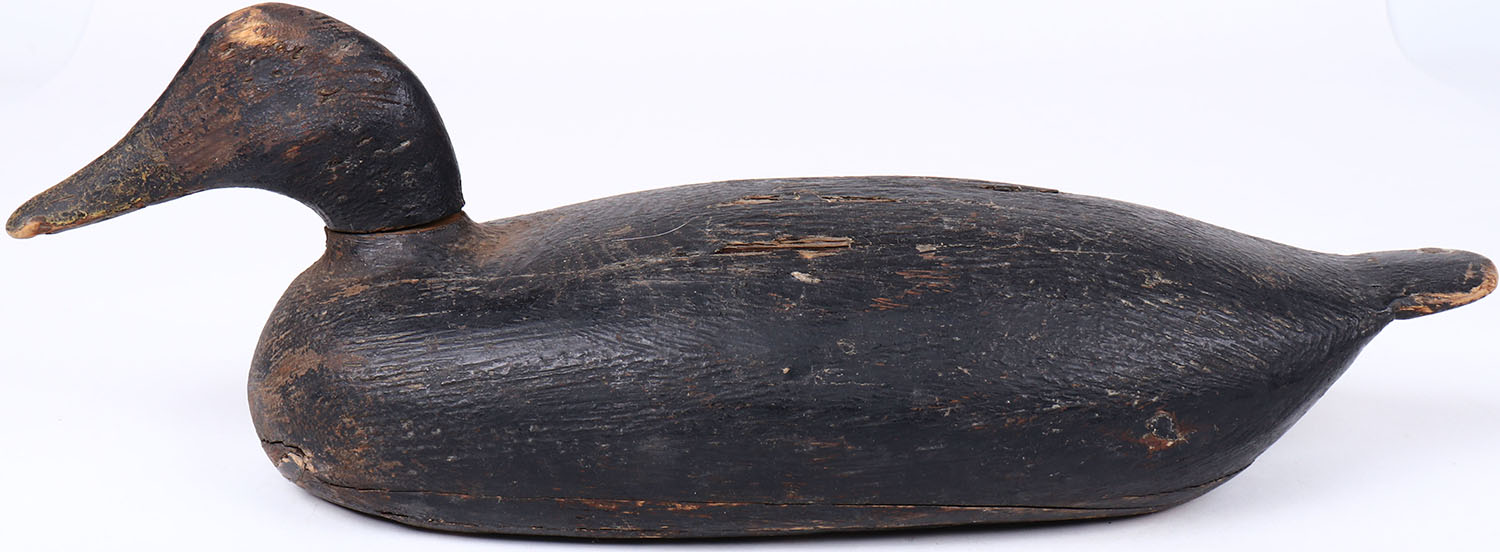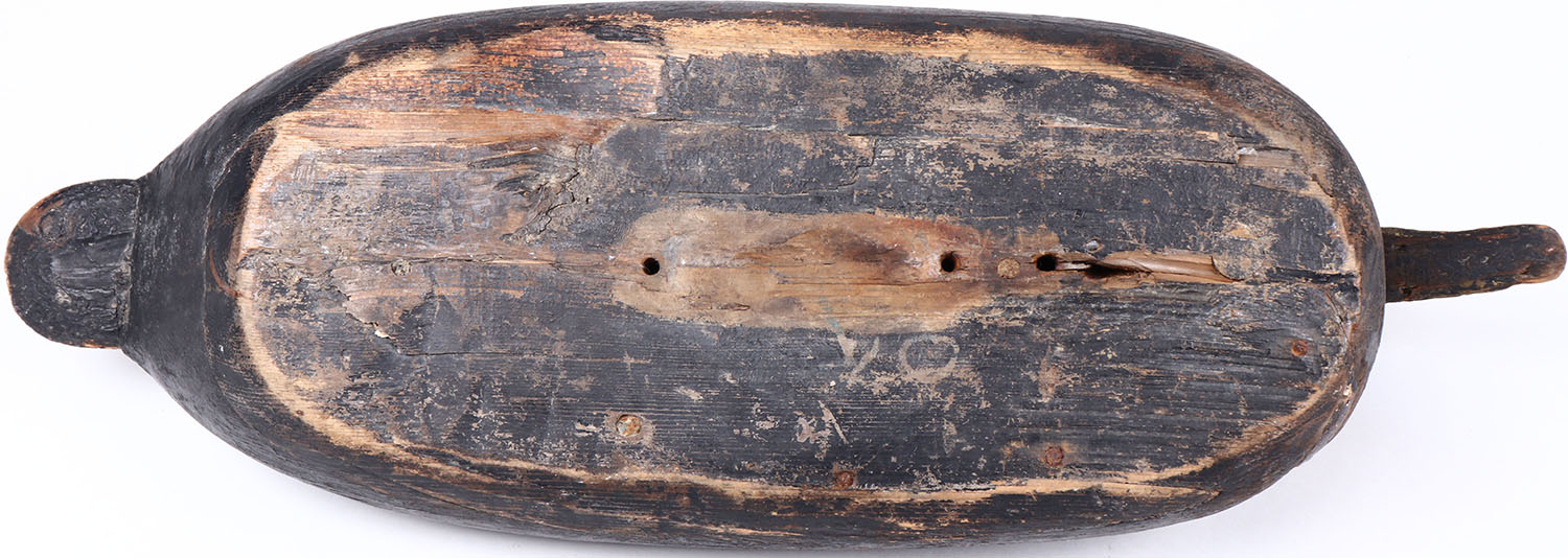 Black Duck by unknown maker, painted eyes, hollow wood, original paint, has age cracks on entire body, head is loose. Grade: Very Good ++ - Value: 30 to 60
