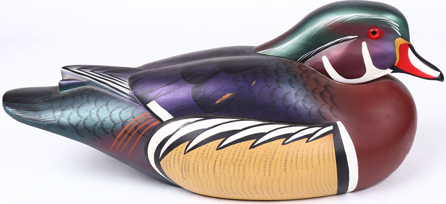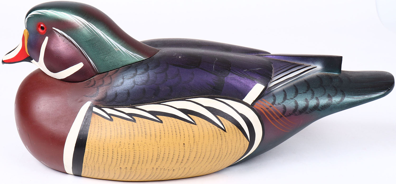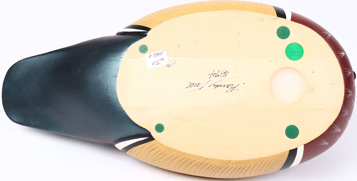 Wood Duck Drake by Randy Tull, glass eyes, solid wood, original paint, structurally excellent, signed on bottom. Grade: MINT - Value: 30 to 60