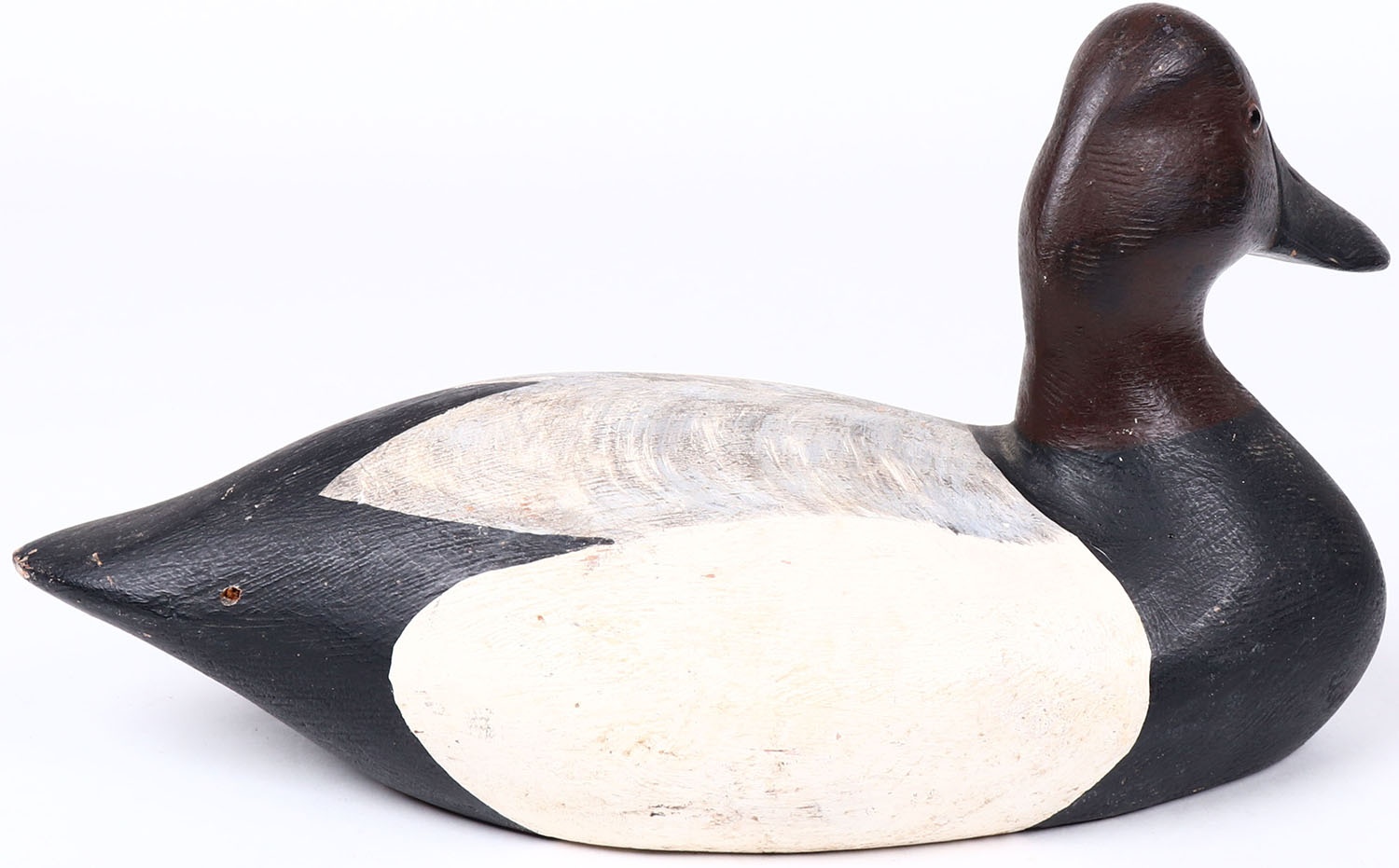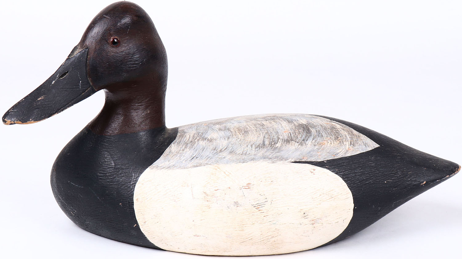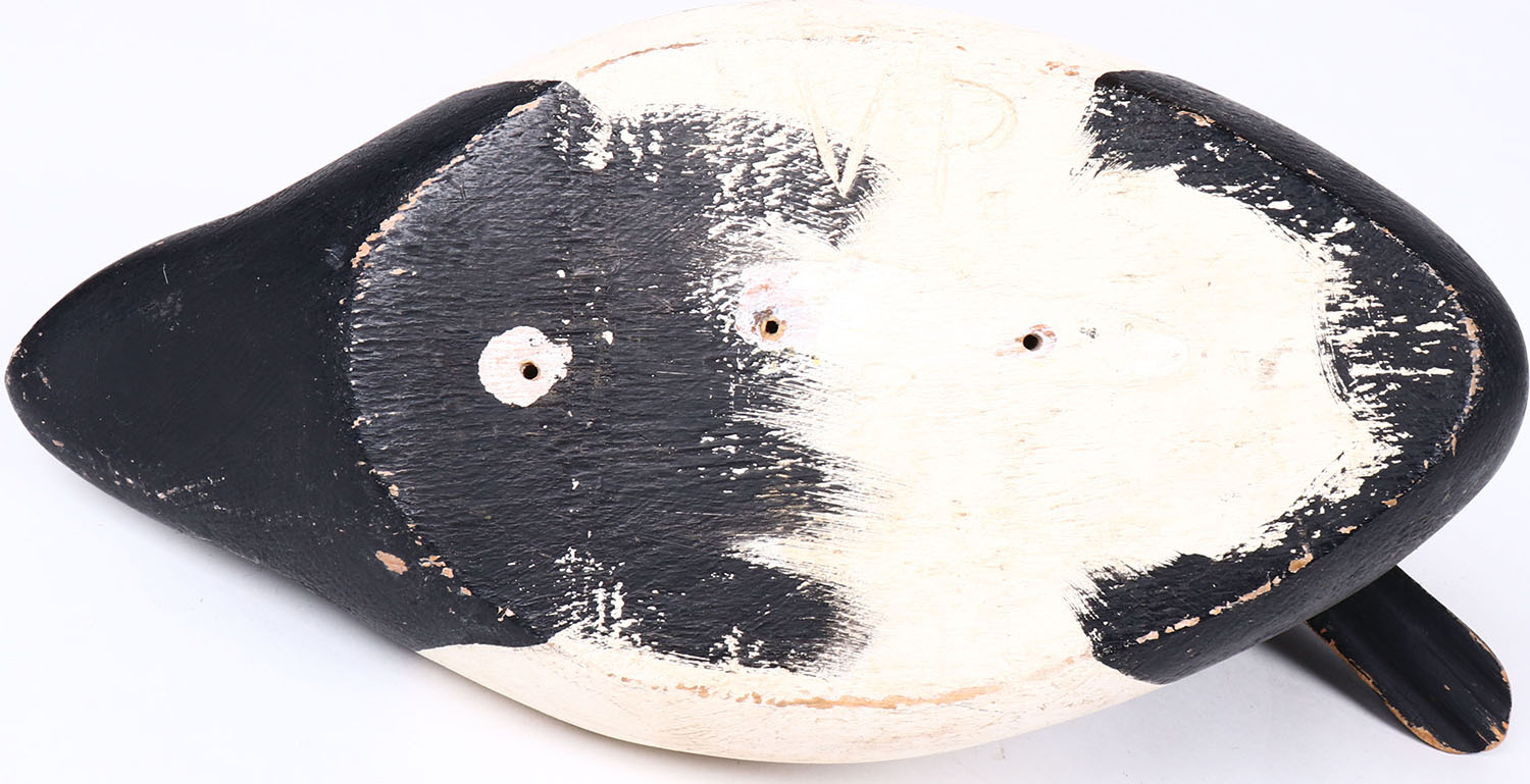 Canvasback Drake by VP, glass eyes, solid wood, original paint, structurally excellent, branded VP on bottom. Grade: MINT - Value: 30 to 60