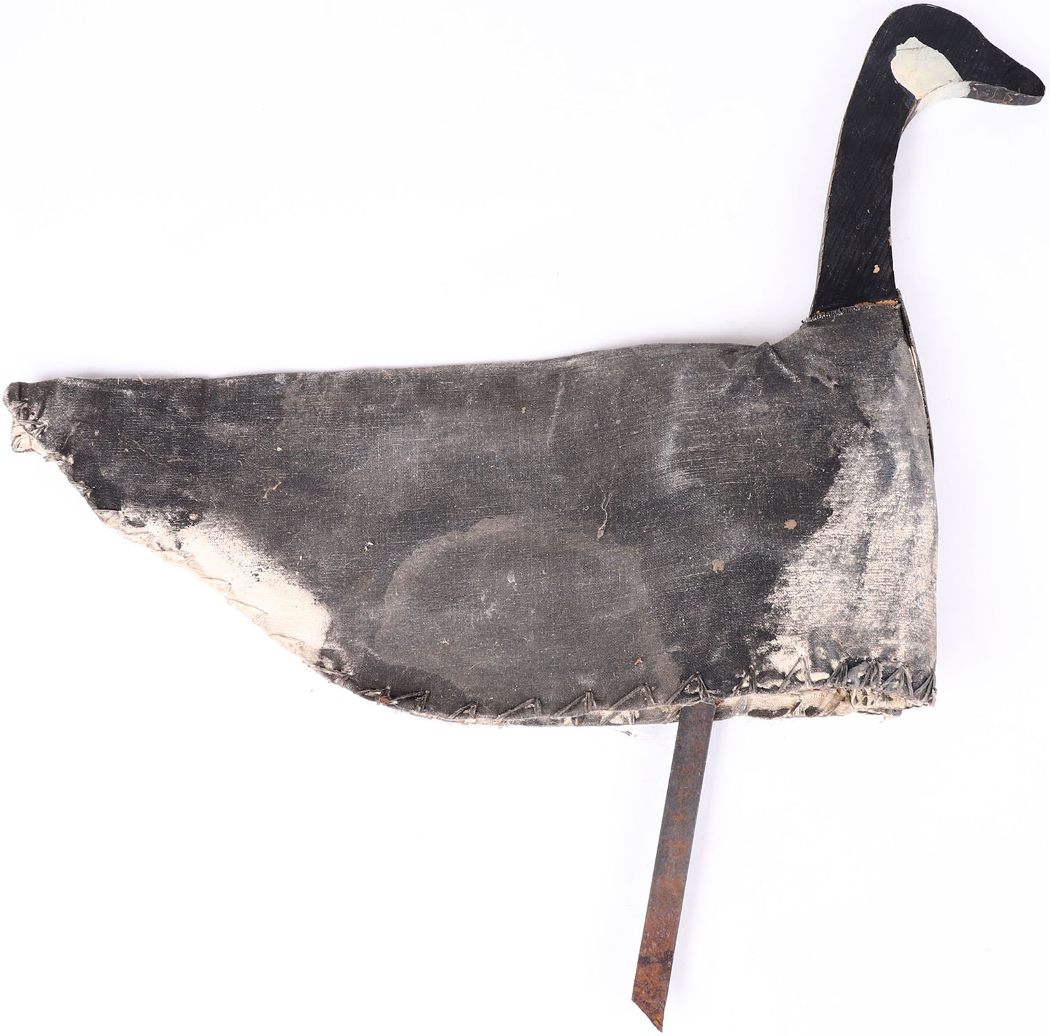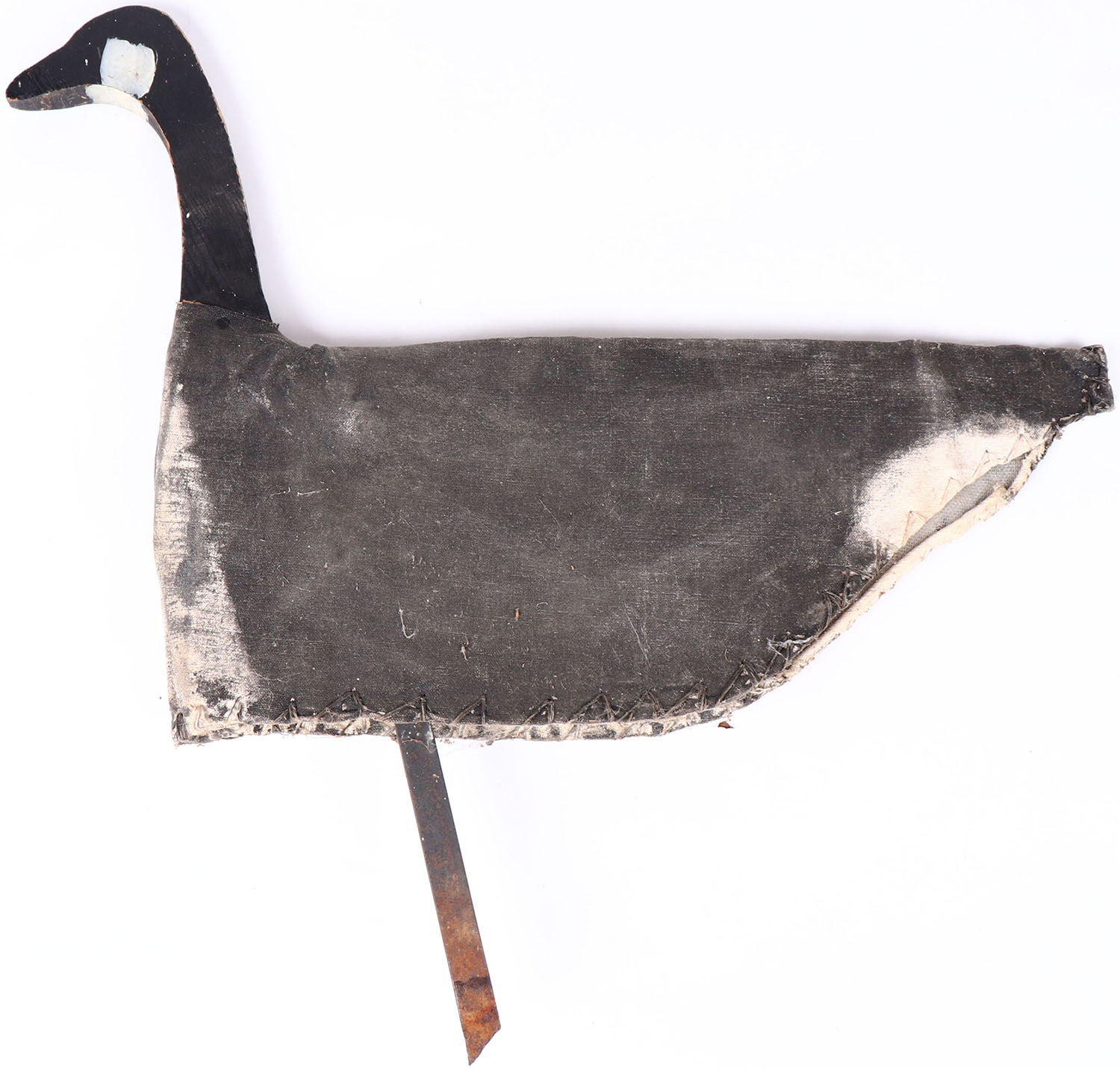 Canada Goose by unknown maker, has wooden stake, canvas over wire body, no eyes, original paint. Grade: Excellent - Value: 30 to 60