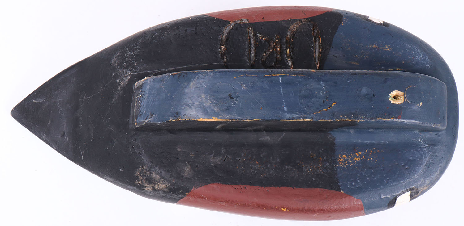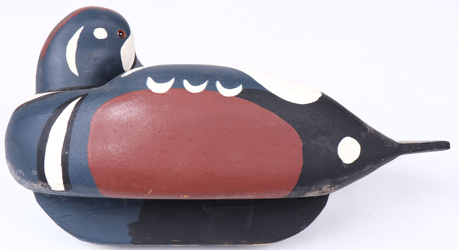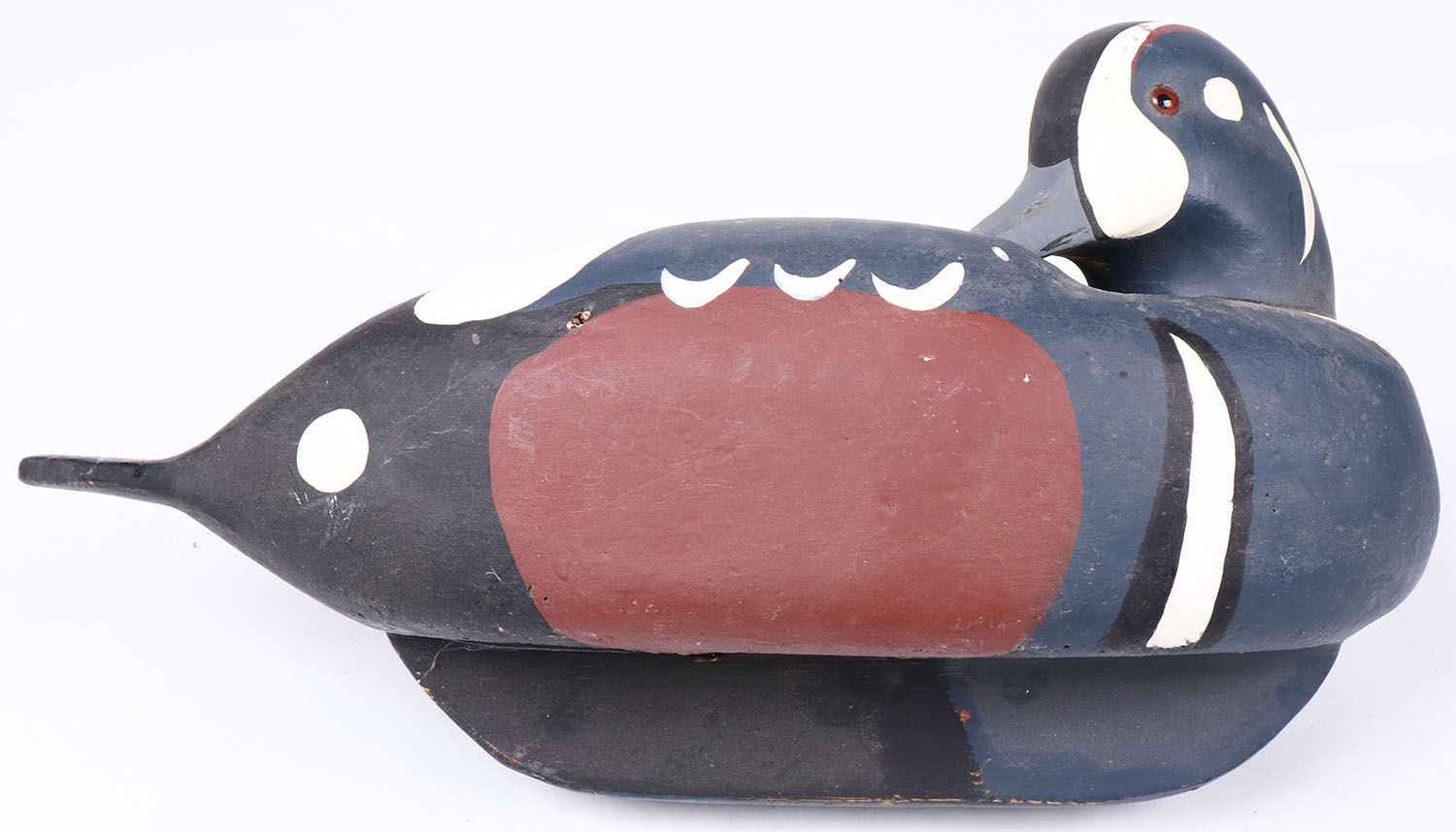 Preening Harlequin Drake by DRD, glass eyes, hollow wood, original paint, structurally excellent, branded DRD on bottom. Grade: MINT - Value: 30 to 60