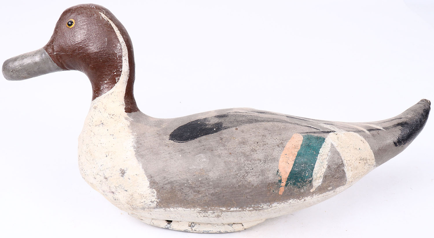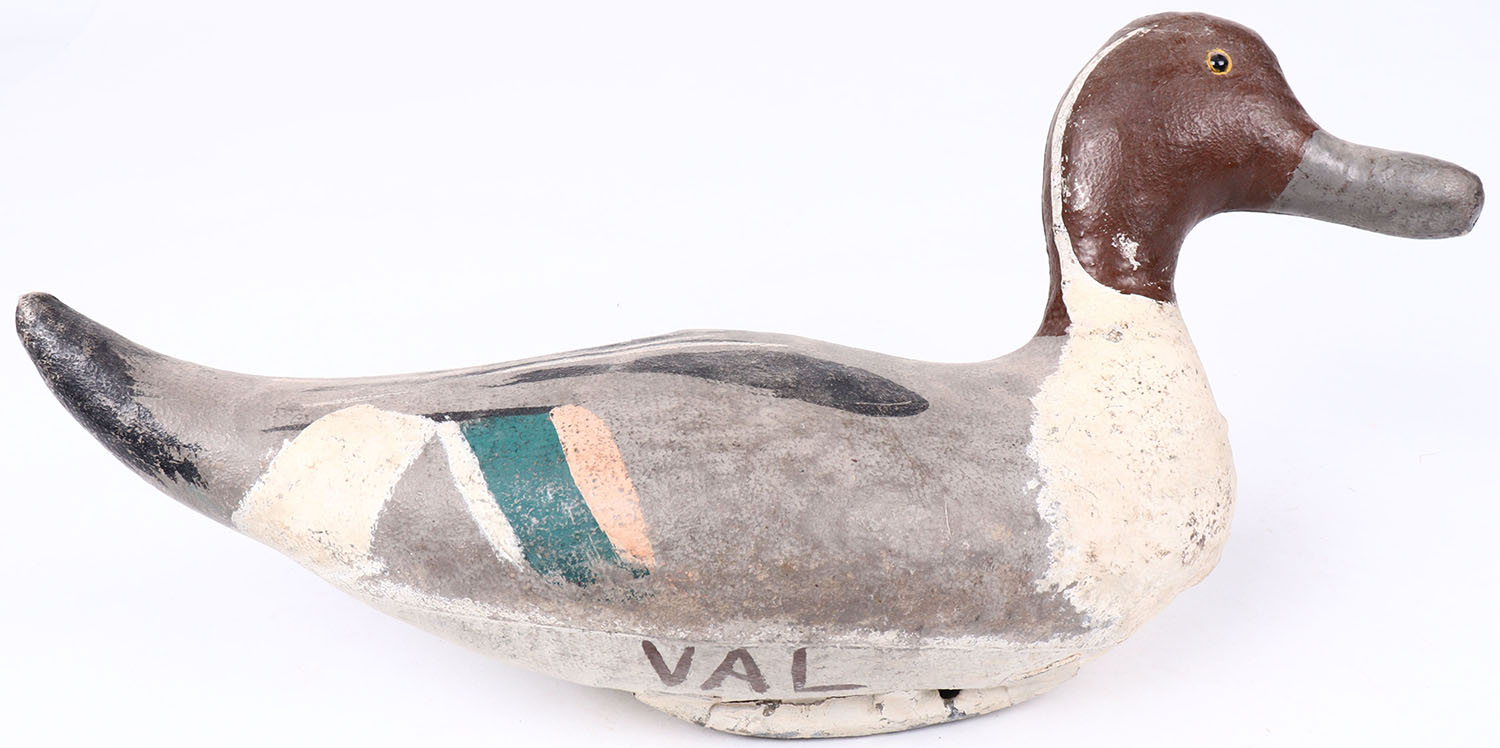 Pintail Drake by Scotts, glass eyes, canvas over cork, branded VAL on bottom, structurally excellent. Grade: Excellent + - Value: 20 to 40
