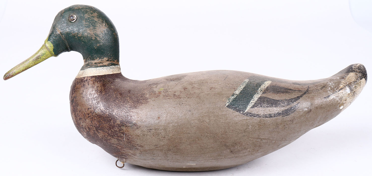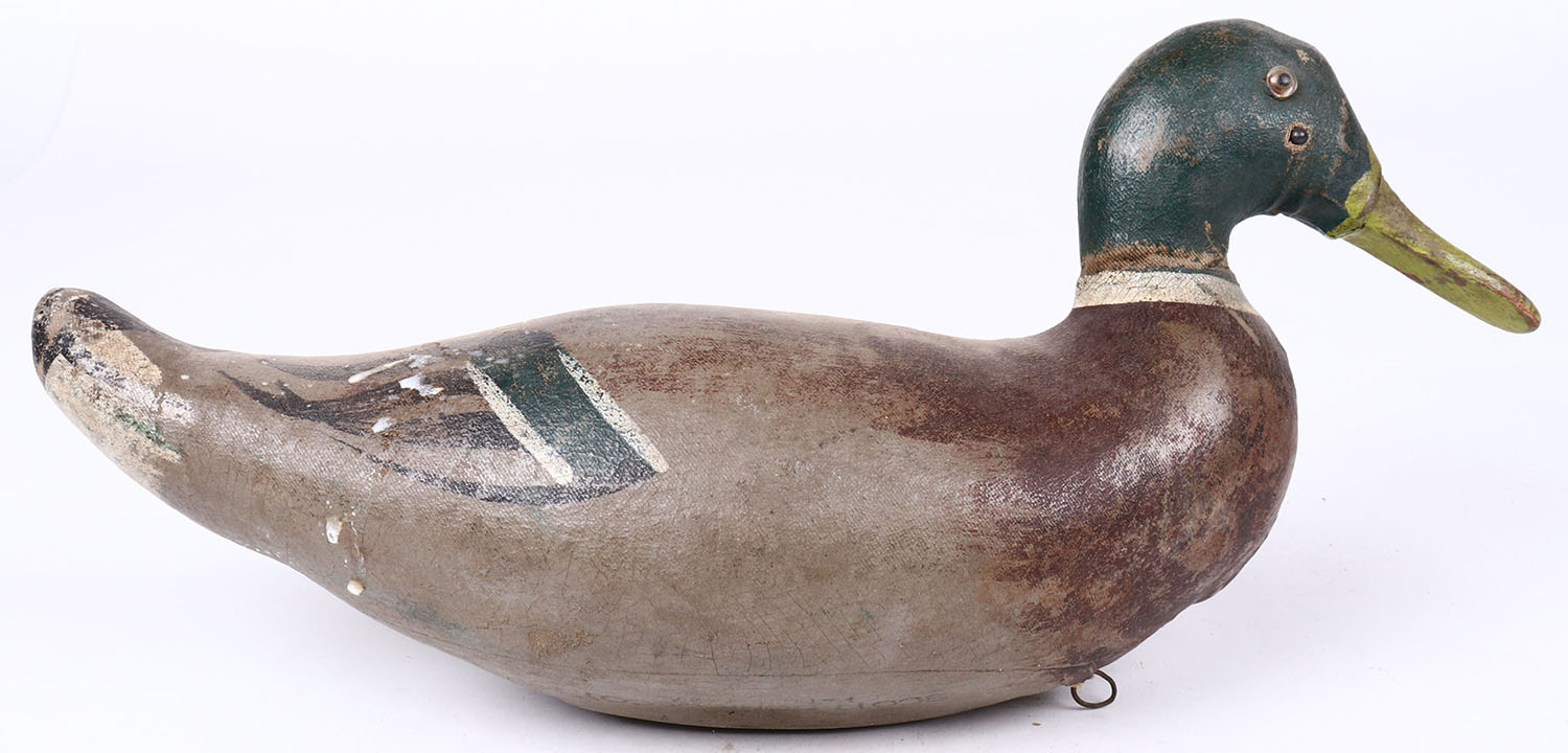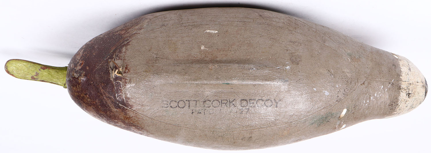 Mallard Drake by Scott Cork Decoy Company, PTD, Oakland, glass eyes, canvas over cork, original paint, structurally excellent. Grade: Excellent + - Value: 50 to 100