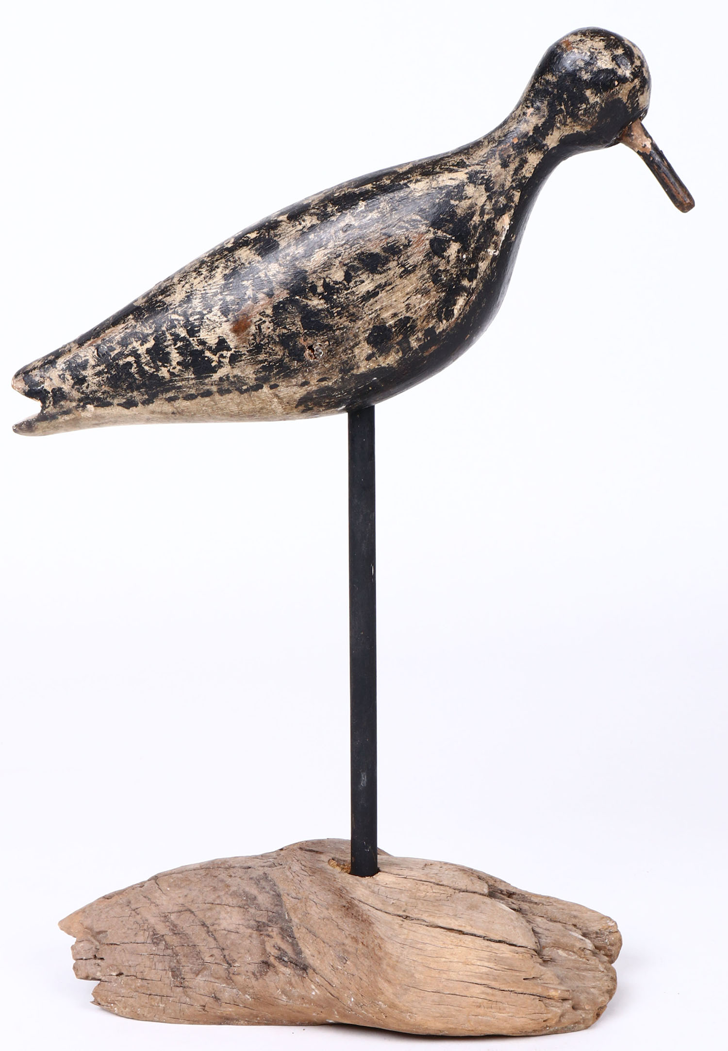 Shorebird by unknown maker, painted eyes, solid wood, on wood stand. Grade: Excellent - Value: 150 to 300