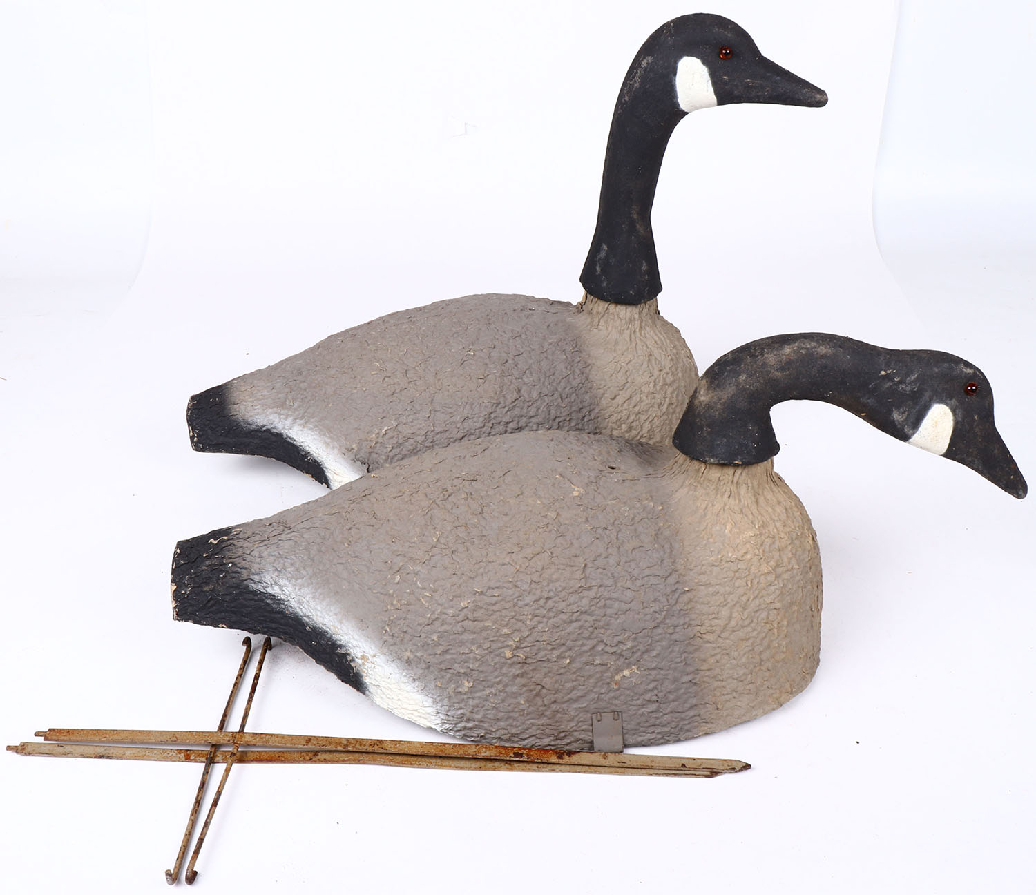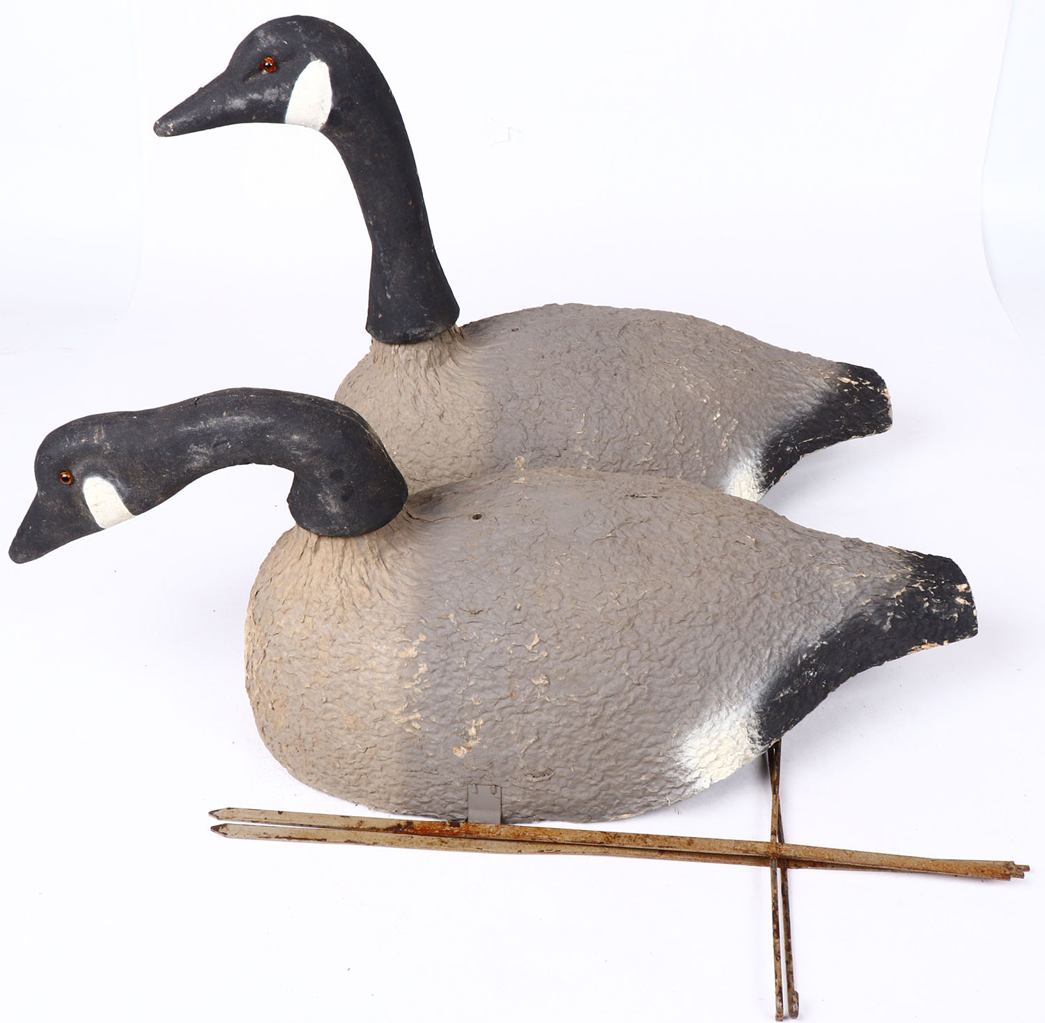 Lot of 2 Canada Geese by unknown maker, glass eyes, paper mache' bodies with metal stands, original paint. Grade: Excellent - Value: 10 to 30