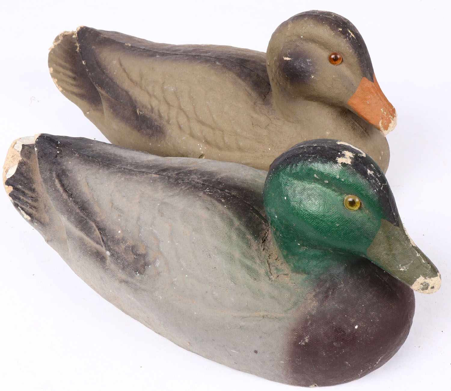 Pair of Mallards by Carry Lite Decoys, glass eyes, original paint. Wear at bill area. Grade: Very Good - Value: 10 to 40
