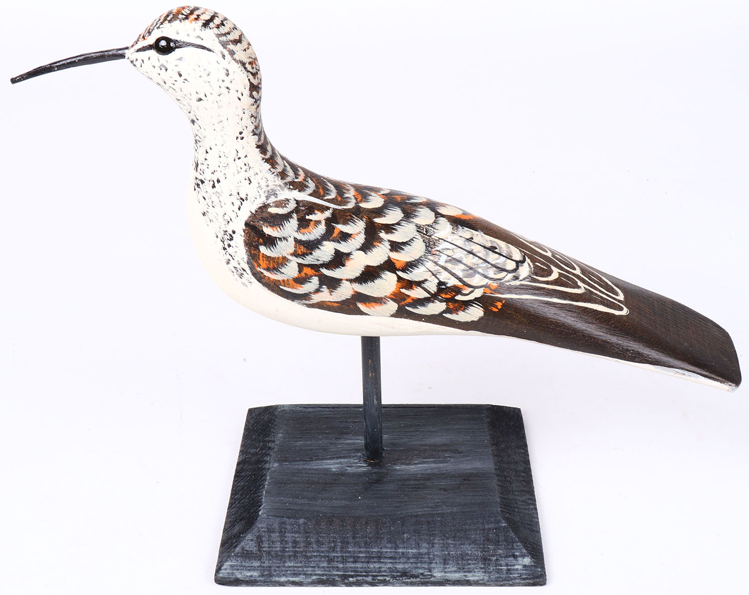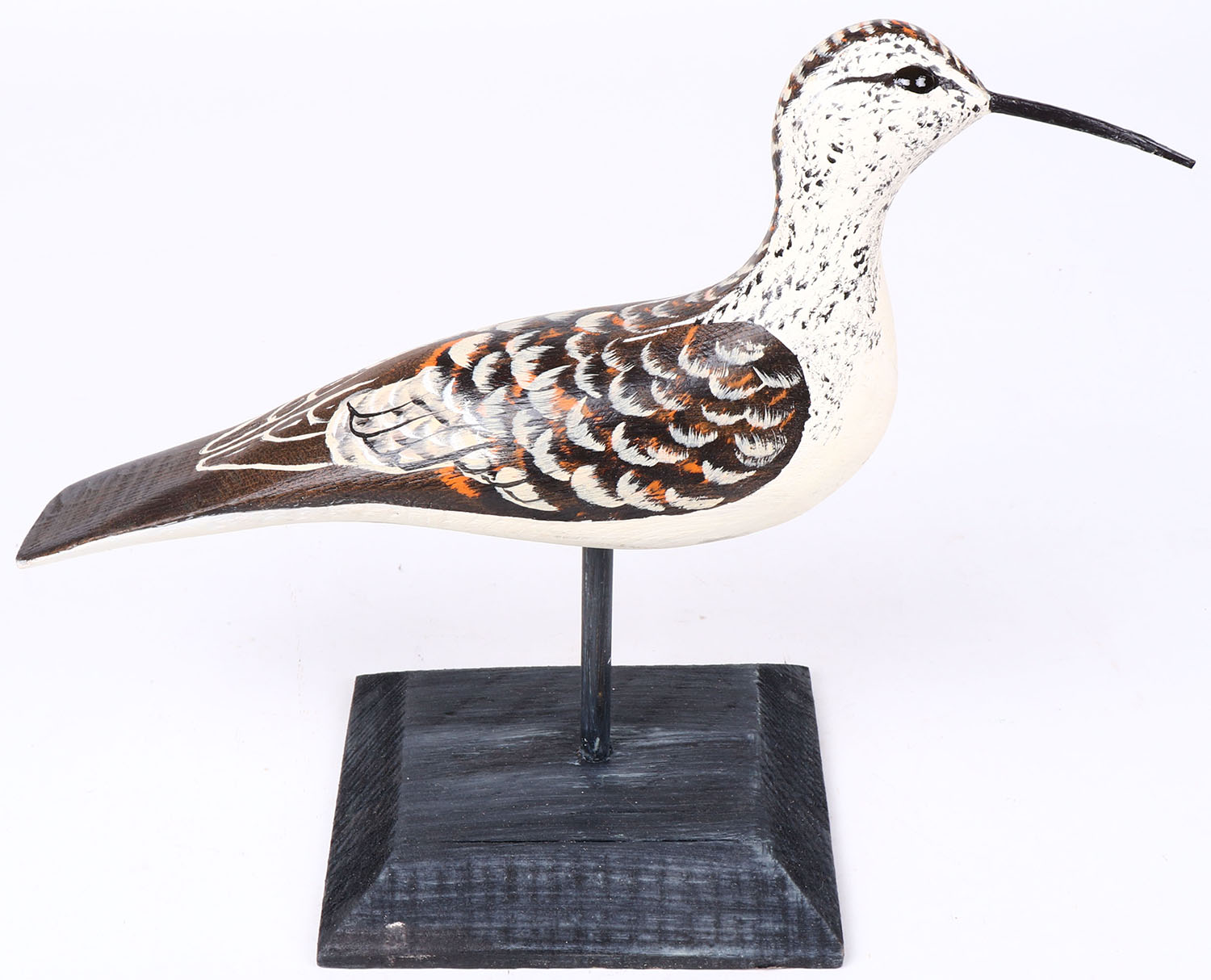 Shorebird by Tom Martindale, Ontario, Canada, glass eyes, solid wood on wood stand, original paint, structurally excellent, signed on bottom. Grade: MINT - Value: 30 to 60