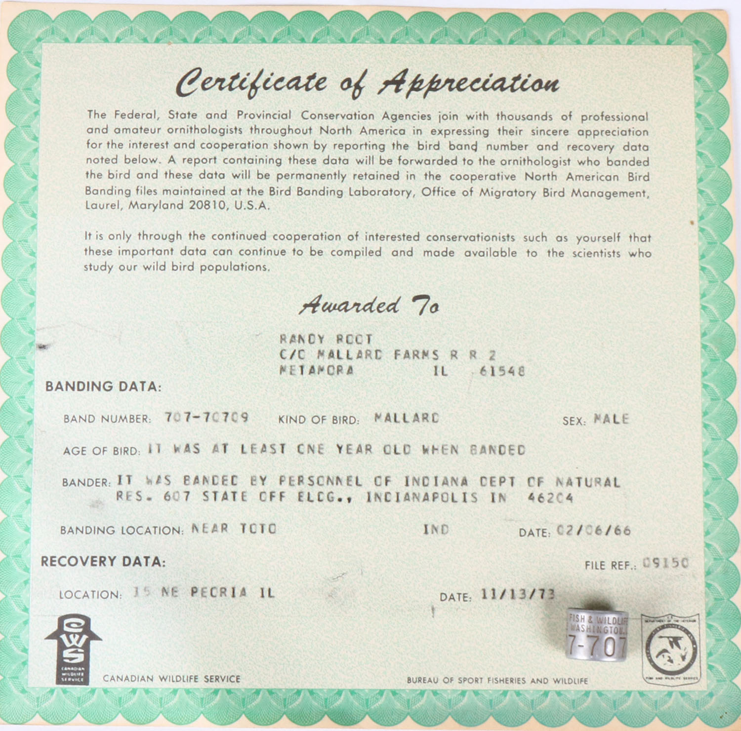 DUCK BAND with certificate from 1966, we are offering a few duck bands with an opportunity to all bands that were all shot at one duck club in Peoria IL from 1964 - 1999, ''MALLARD FARMS R R 2'', over 60 bands available to the highest bidder, each one has a certificate, some ducks were over 10 years old, rare opportunity to many duck bands with cert. all from on duck club, this one was banded in IND 02/06/1966 and shot 11/13/1973. Grade: Excellent - Value: 30 to 100