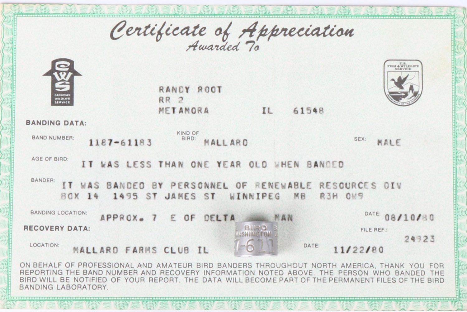 DUCK BAND with certificate from 1966, we are offering a few duck bands with an opportunity to all bands that were all shot at one duck club in Peoria IL from 1964 - 1999, ''MALLARD FARMS R R 2'', over 60 bands available to the highest bidder, each one has a certificate, some ducks were over 10 years old, rare opportunity to many duck bands with cert. all from on duck club, this one was banded 7 miles east of Delta MAN 08/10/1980 and shot 11/221980. Grade: Excellent - Value: 30 to 100