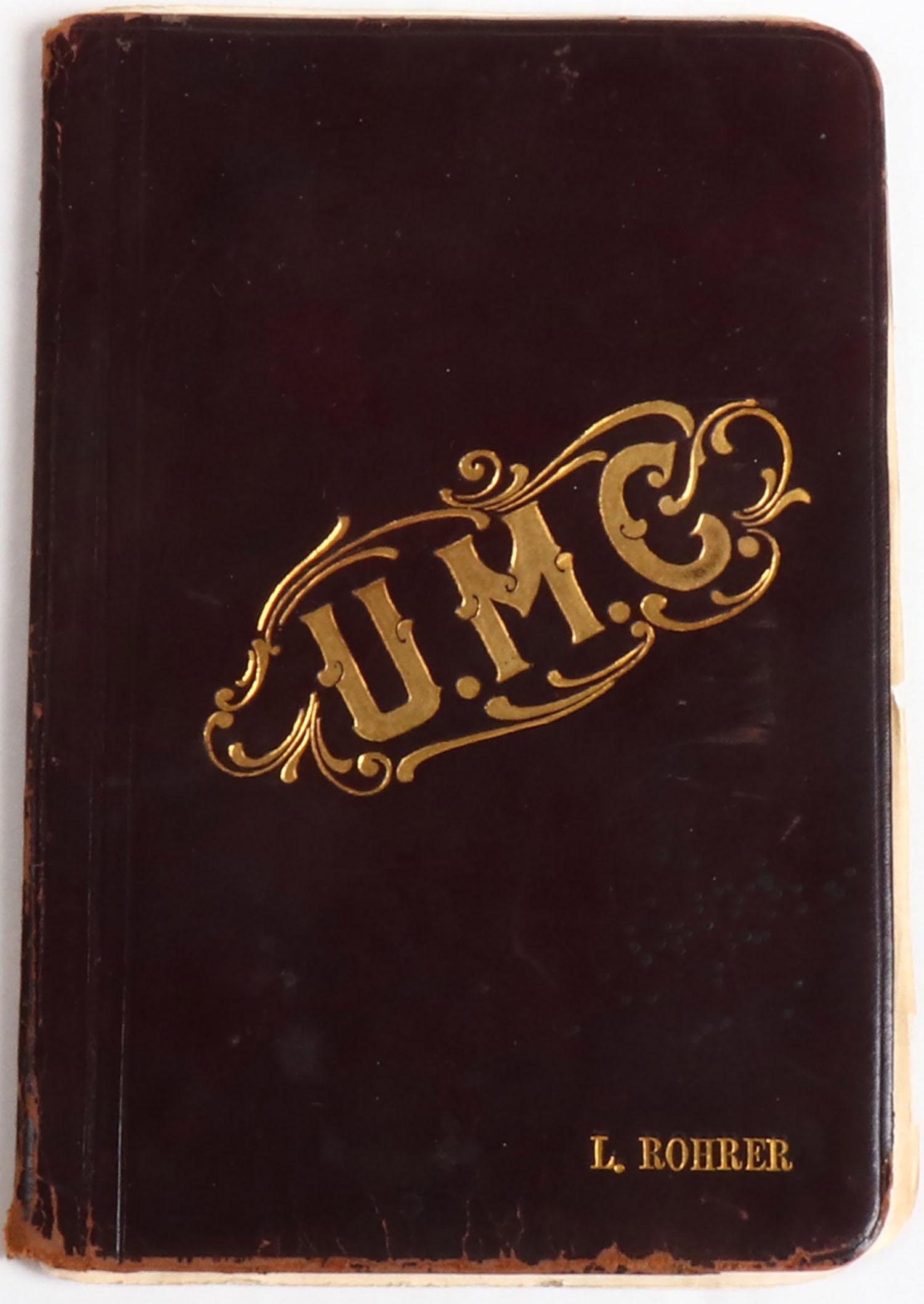 U.M.C. notebook by L. Rohrer, blank, pages are loose, softcover very good, 6 1/2'' x 4 1/2''. Grade: Excellent - Value: 2 to 60