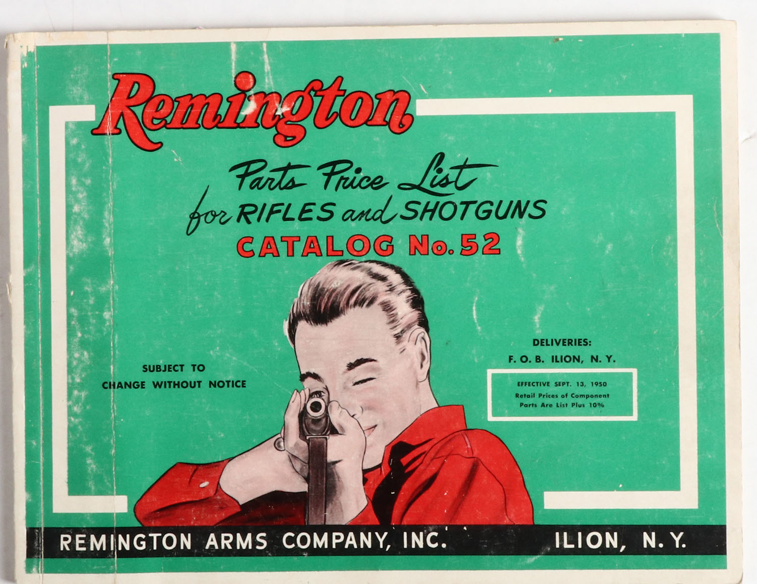 Remington Parts Price List for Rifles and Shotguns Catalog No. 52 1950, 8 1/2'' x 11''. 100 pages, pages clean, binding tight, softcover excellent, b/w images. Value: $45 Grade: Excellent + - Value: 2 to 50
