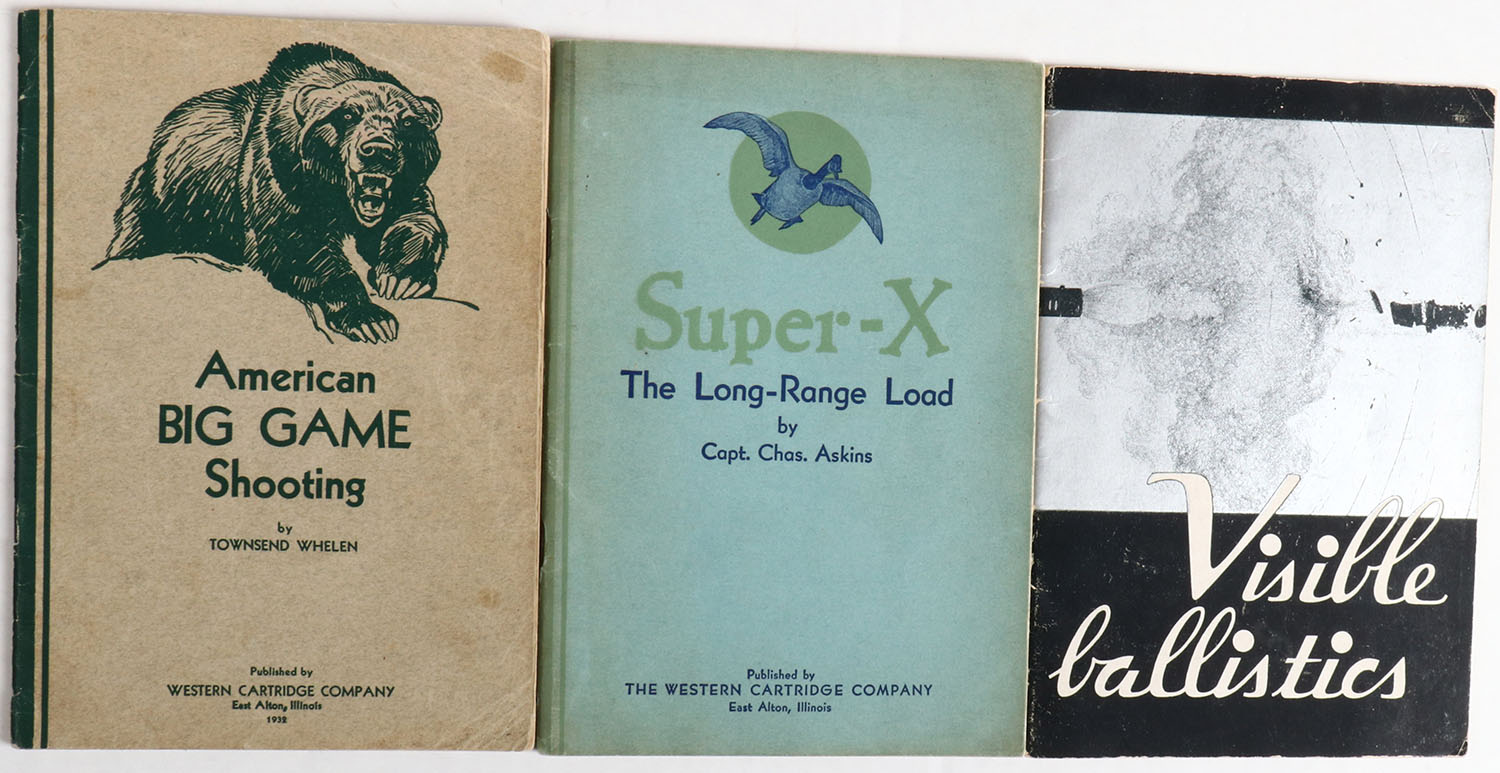 Lot of 3 (1) Super-X The Long-Range Load by Capt. Chas. Adkins (1) Visible Ballistics by The Peters Cartridge Company (1) American Big Game Shooting by Townsend Whelen 1939, all 5 1/2'' x 8''. Staplebound, papercover very good. Grade: Excellent - Value: 6 to 60