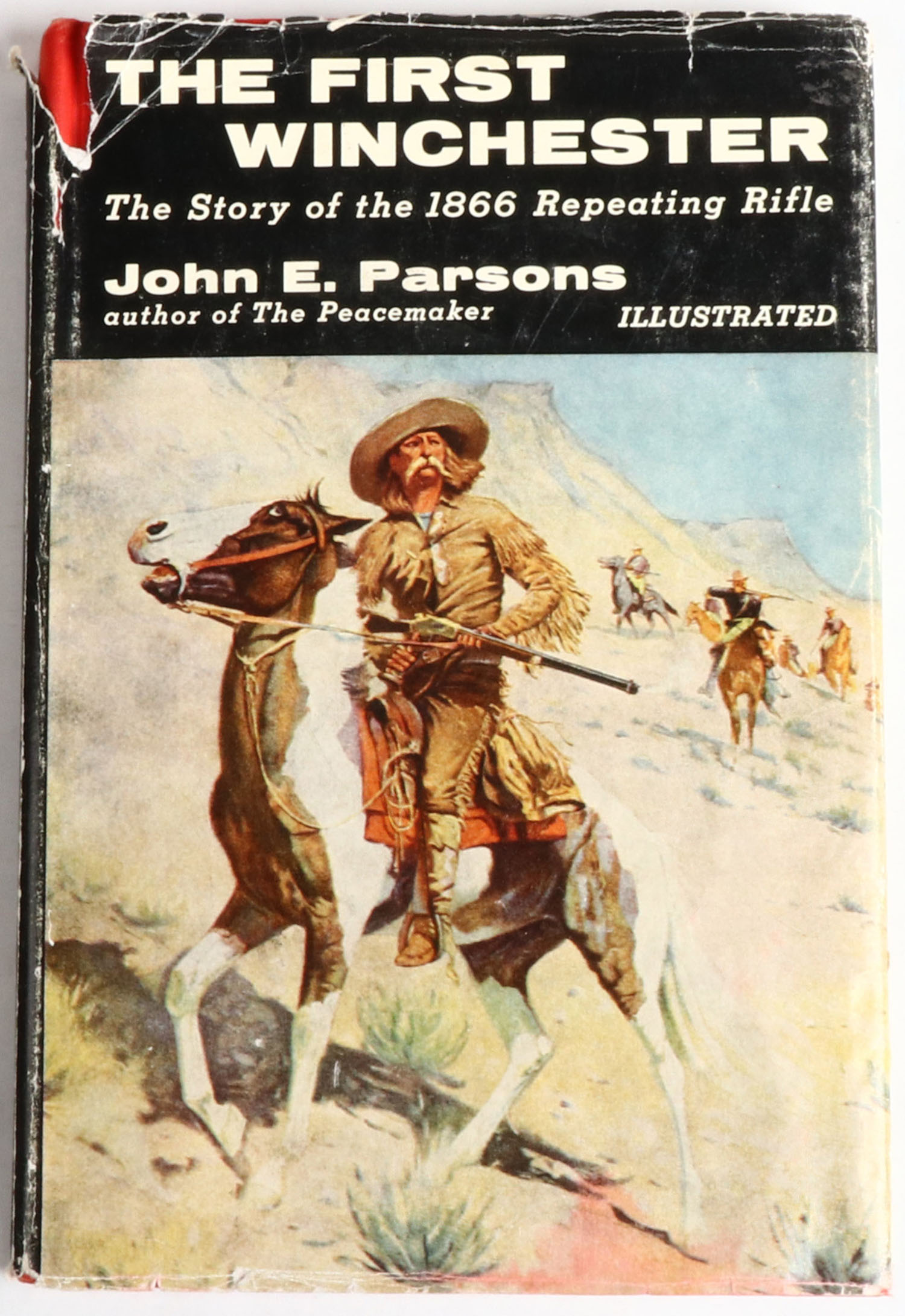 The First Winchester: The Story of the 1866 Repeating Rifle by John E. Parsons, 6 1/2'' x 9 1/2''. 207 pages, pages clean, binding tight, hardcover excellent, dustjacket has tears, b/w images. Value: $130 Grade: Excellent + - Value: 2 to 100