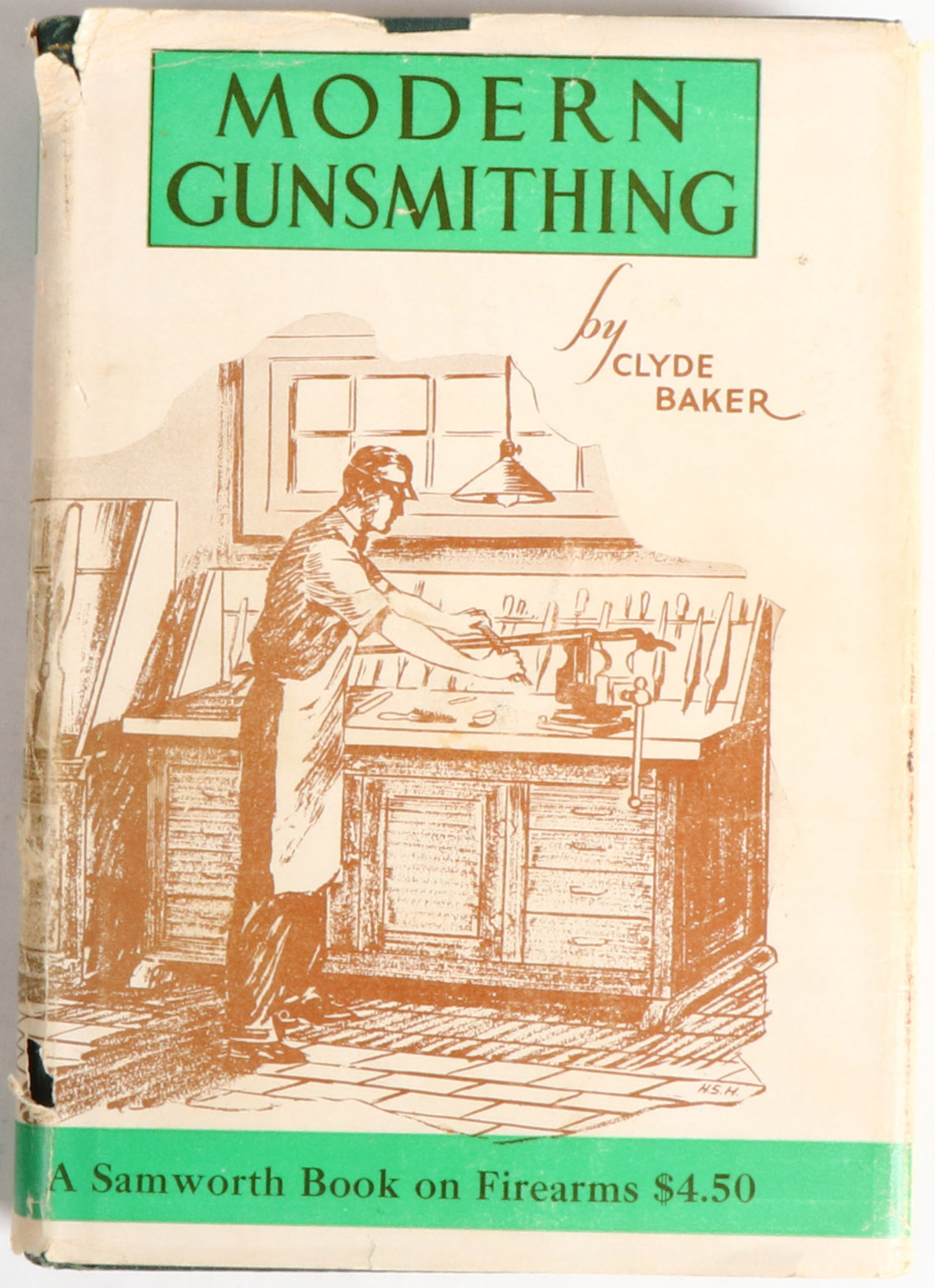 Modern Gunsmithing: A Manual of Firearms Design, Construction and Remodeling, for Amateurs and Professionals 1933 by Clyde Baker, 6'' x 8 1/2''. 527 pages, pages clean, binding tight, hardcover and dustjacket very good, dustjacket has some tears, b/w images. Value: $60 Grade: Excellent + - Value: 2 to 60