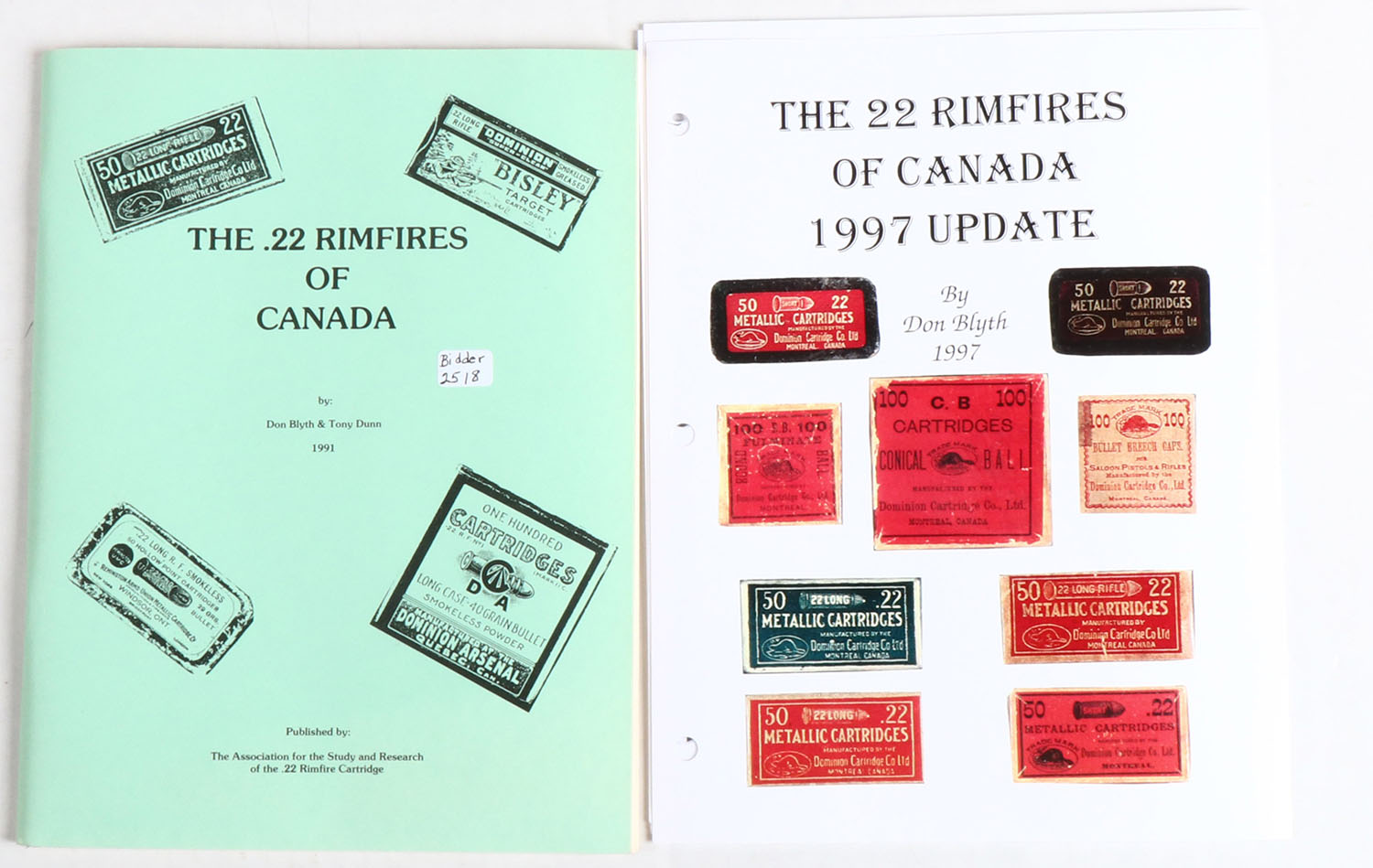 The .22 Rimfires of Canada by Don Blyth & Tony Dunn 1991, 8 1/2'' x 11''. 162 pages, pages clean, staplebound, b/w and colored images. Grade: Excellent - Value: 2 to 60