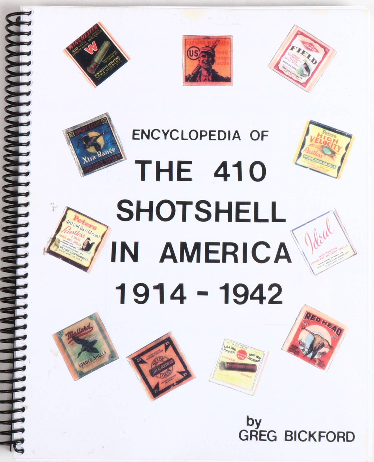 Encyclopedia of The 410 Shotshell in America 1914-1942 by Greg Bickford, 9'' x 11''. 181 pages, pages clean, binding tight, softcover excellent, b/w and colored images. Grade: Very Good ++ - Value: 2 to 50