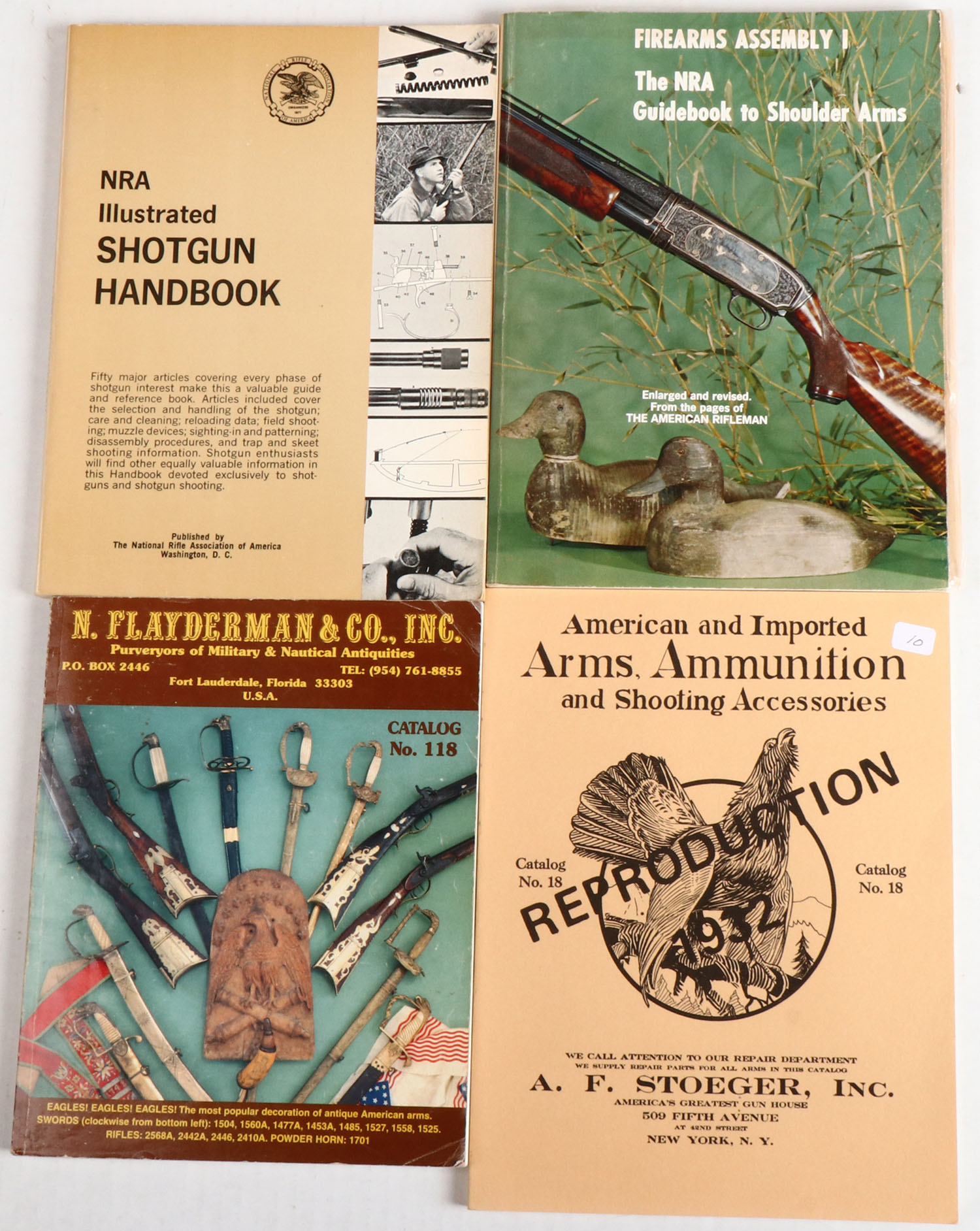 Lot of 4 (1) N. Flayderman & Co., Inc Purveryors of Military & Nautical Antiquities Catalog No. 118, 8'' x 10''. (1) Firearms Assembly I The NRA Guidebook to Shoulder Arms, 8 1/2'' x 11''. (1) NRA Illustrated Shotgun Handbook, 8 1/2'' x 11''. (1) American and Imported Arms, Ammunition and Shooting Accessories, 8 1/2'' x 11''. Grade: Very Good ++ - Value: 2 to 50
