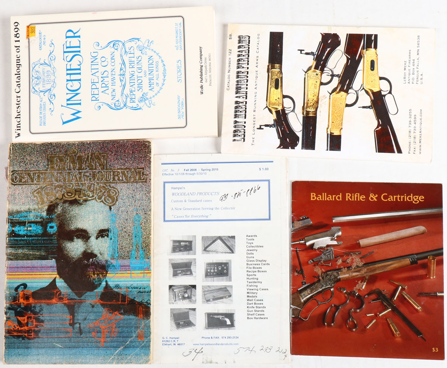 Lot of 5 (1) Lyman Centennial Journal 1878-1978, 6'' x 9''. (1) Hampel's Woodland Products Catalog No. 3, 5 1/2'' x 8 1/2''. (1) Ballard Rifle & Cartridge, 6'' x 7''. Larry Merz Antique Firearms Catalog Number 122, 5 1/2'' x 8 1/2''. (1) Winchester Catalog of 1899, 5'' x 8 1/2''. Grade: Excellent - Value: 2 to 40