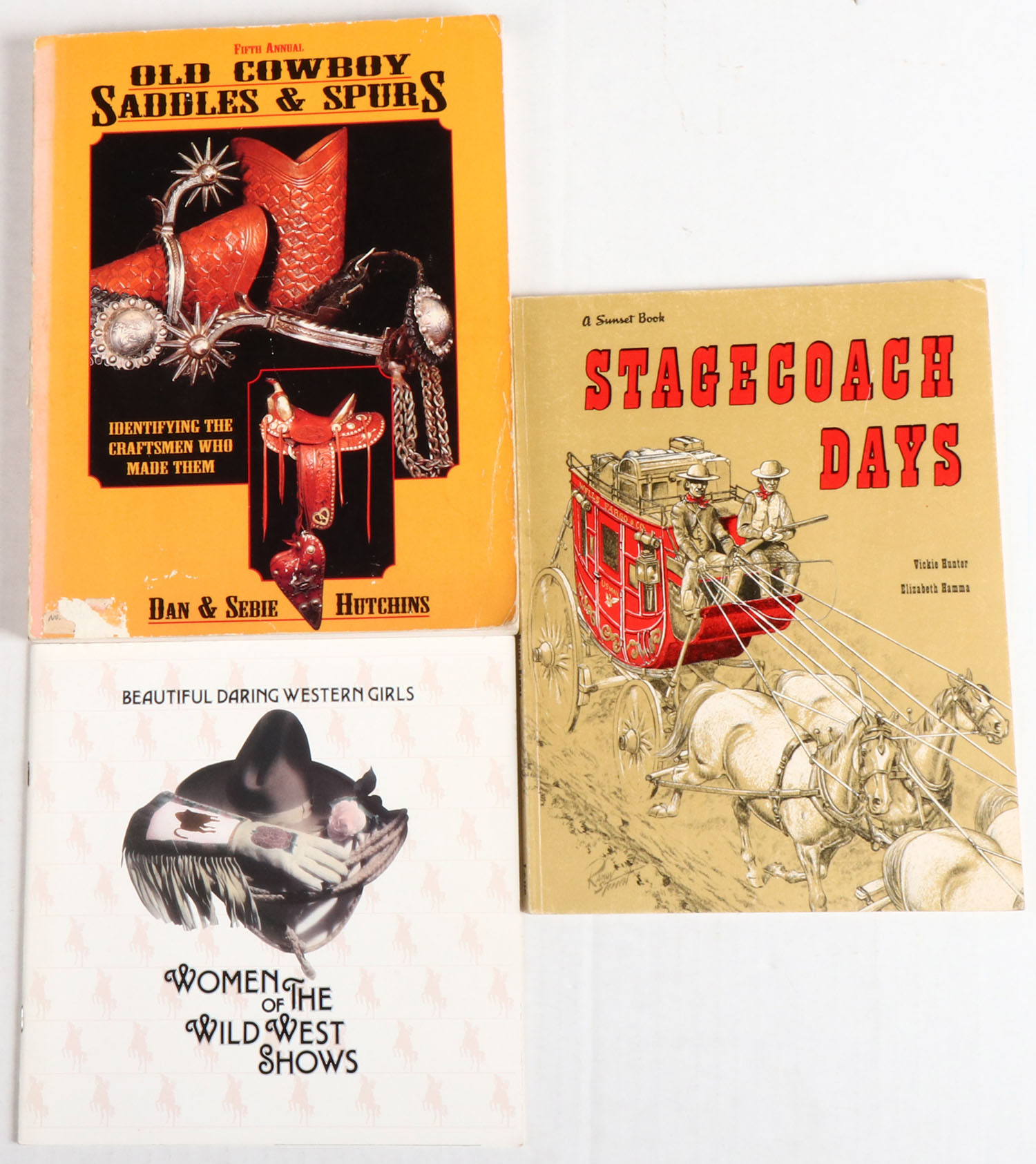 Lot of 3 (1) Old Cowboy Saddles & Spurs by Dan & Serbie Hutchins, 8 1/2'' x 11''. (1) A Sunset Book Stagecoach Days by Vickie Hunter and Elixsbeth Hamma, 8 1/2'' x 10 1/2''. (1) Beautiful Daring Western Girls: Women of The Wild West Shows, 8 1/2'' x 8 1/2''. Grade: Excellent - Value: 2 to 50