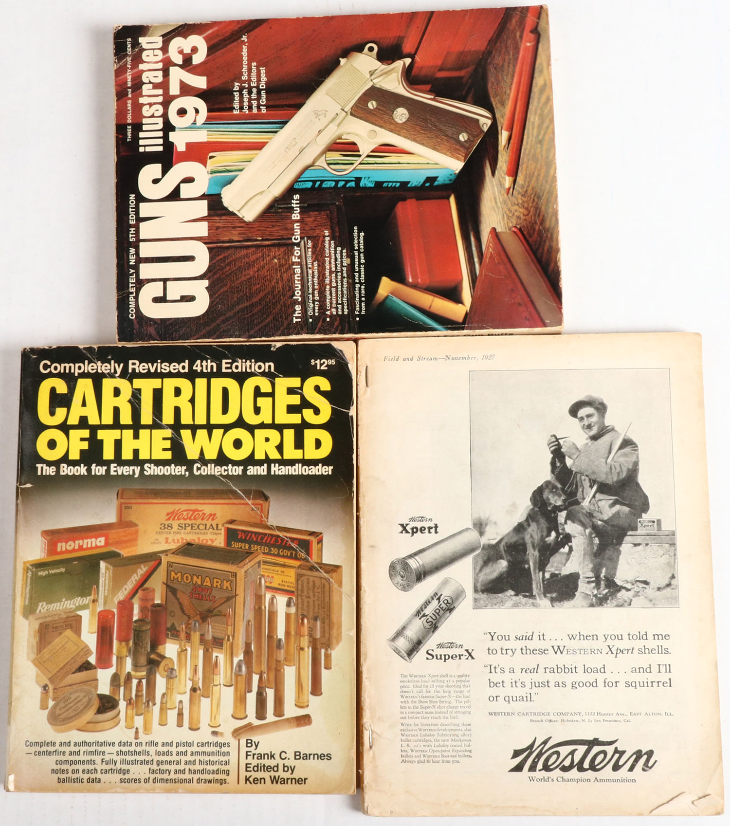 Lot of 3 Gun & ammo catalogs: (1) Cartridges of the World, 8 1/2'' x 11''. (1) Guns by Joseph J. Schroeder, JR. 8 1/2'' x 11''. (1) Western Field & Stream 1927 Catalog, 8 1/2'' x 11 1/2''. Grade: Excellent - Value: 2 to 60