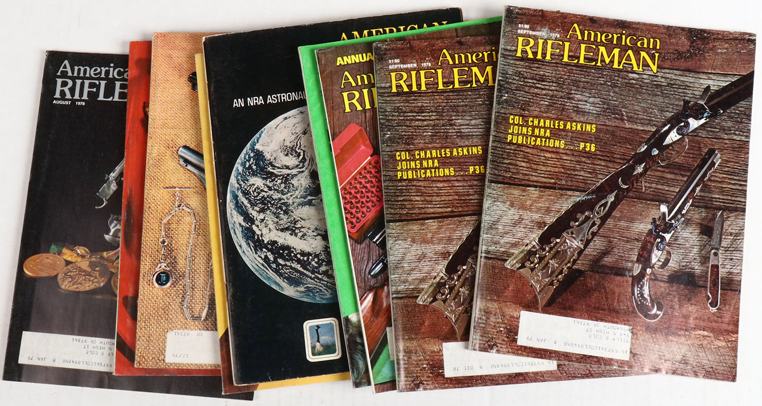 Lot of 9 Vintage American Rifleman Magazines, all 8'' x 10 1/2''. Grade: Excellent - Value: 2 to 60