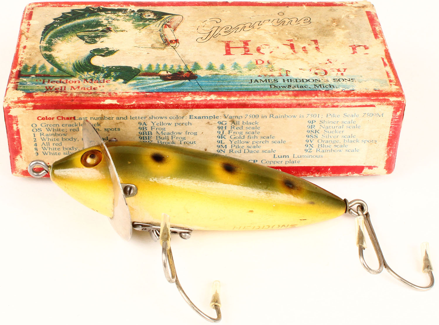 Heddon 210 Surface in box marked 219B, Green frog pattern wood lure, GE, 2 hooks, Surface-rig, lure is excellent & box shows age soiling. Grade: Excellent - Value: 30 to 150