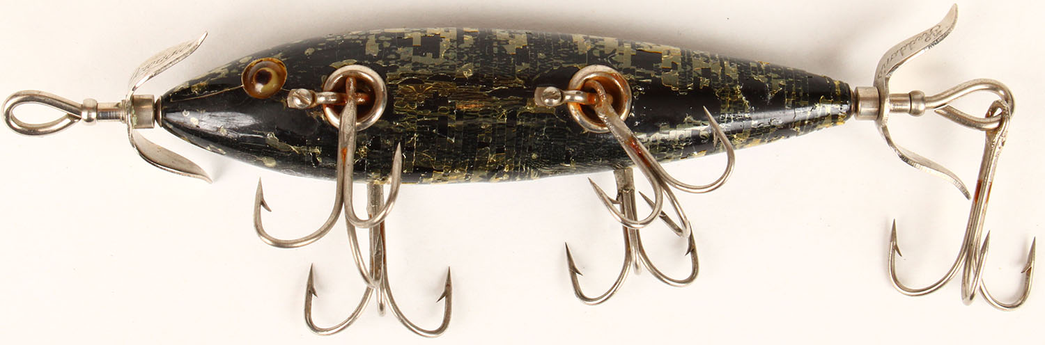 Heddon Dowagiac 150, 5 hook wood lure, all black with crazing, GE, 2 hooks, L-rig, lure is excellent other than the crazing. Grade: Very Good + - Value: 20 to 150