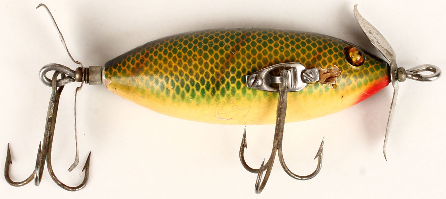 Heddon SOS, wood lure, GE, green scale pattern, 2 hooks, surface rig. Grade: Excellent ++ - Value: 20 to 70