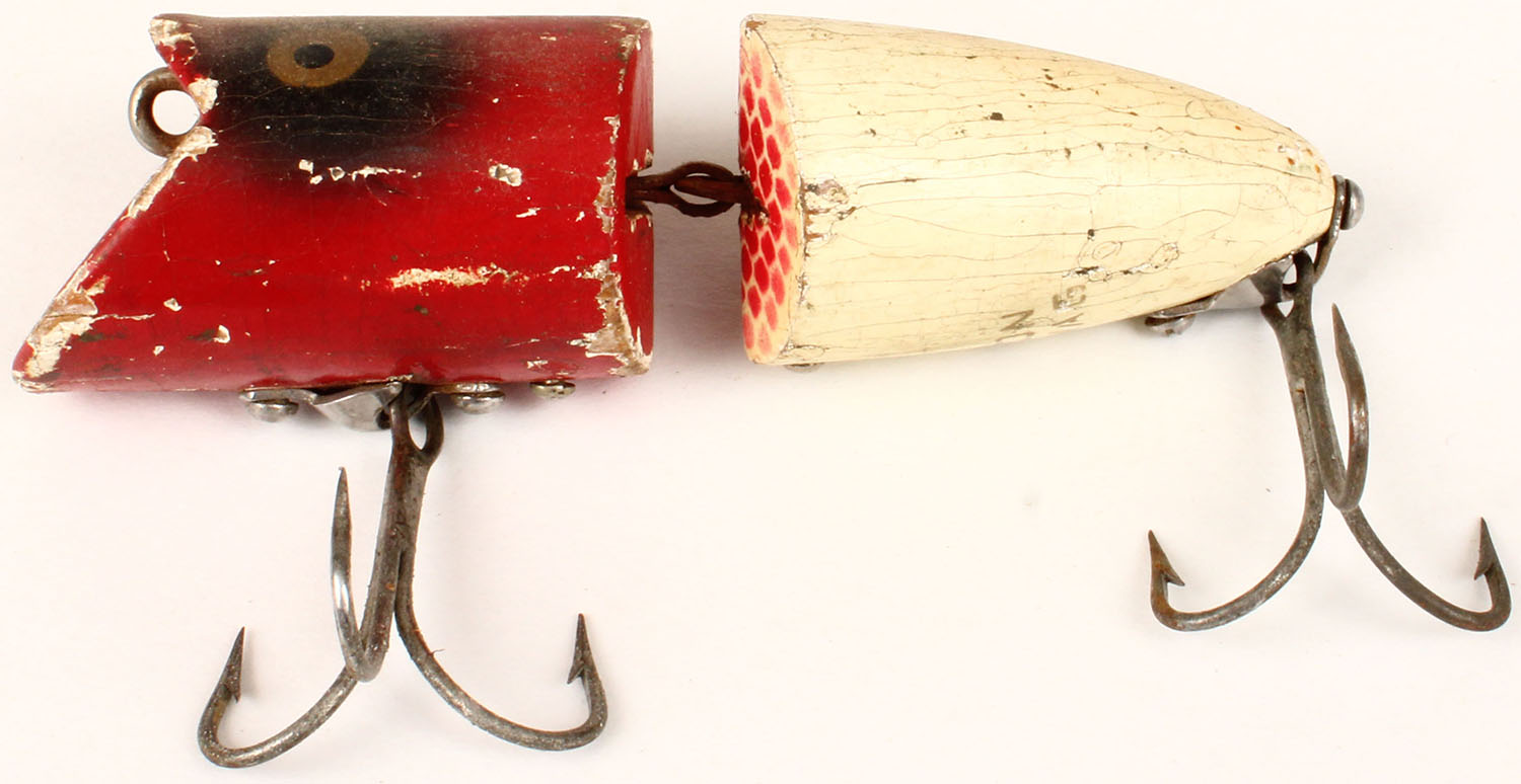 Heddon King Zig-Wag Jr., wood lure, PE, red & white, 2 hooks, surface rig.. Grade: Good ++ - Value: 6 to 30