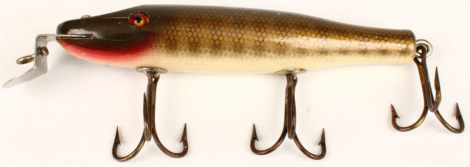 Creek Chub Pikie, Gold Shiner Scale, GE, near mint with very light crazing, 3 hook wood lure. Grade: Excellent ++ - Value: 10 to 50