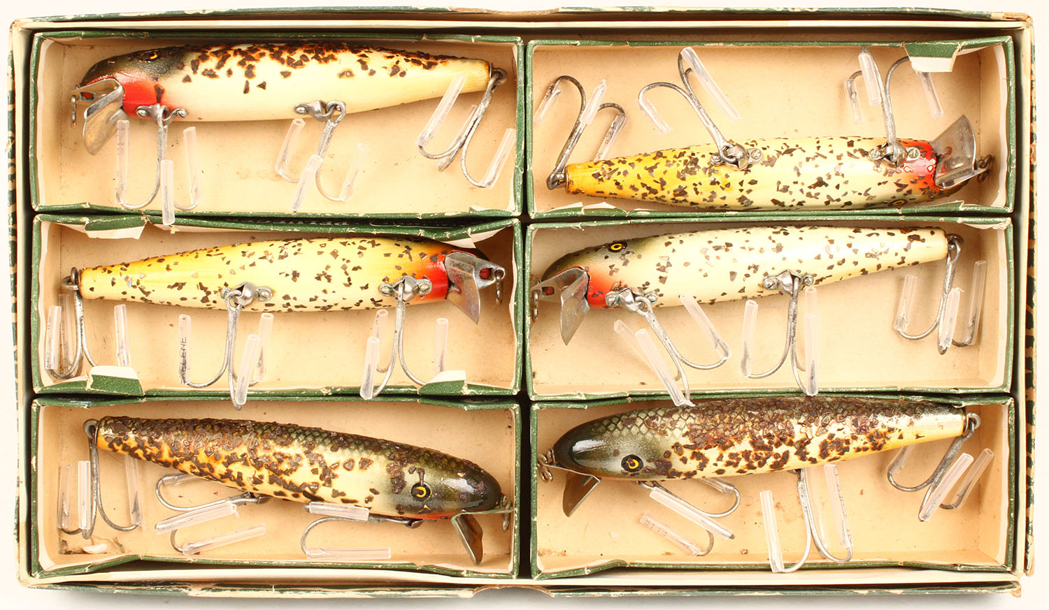 Full Case of 6 Pflueger No. 5003 wood minnow, silver sparks with green head, all lures have their own box inside of case with no lids, inside lures & boxes are stone cold mint, case box shows some age soiling. Grade: Excellent ++ - Value: 100 to 500