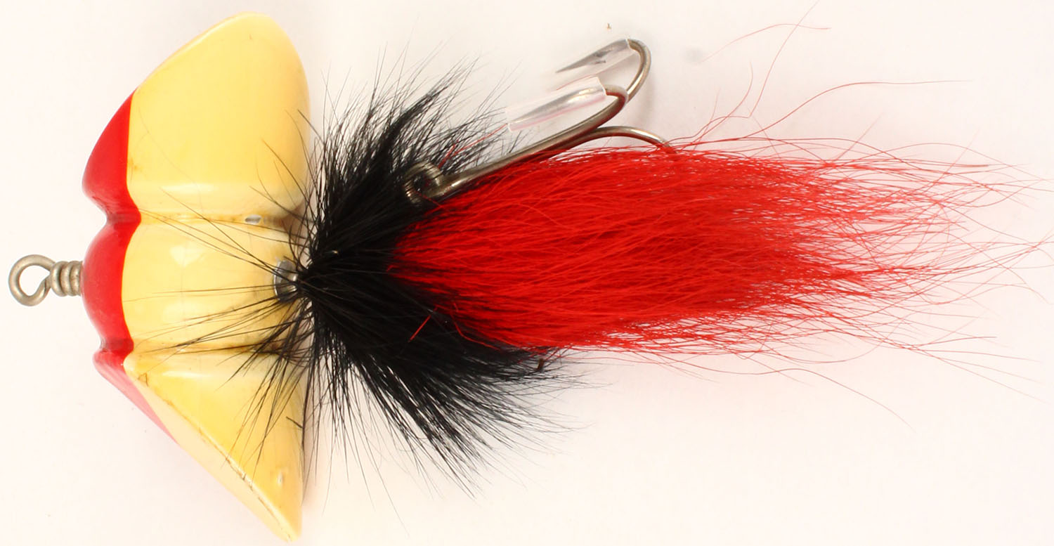 South Bend Whiri-Oreno with feather skirt, no eyes, red & white, 2 hooks & red & black hair skirts, very nice condition. Grade: Excellent ++ - Value: 40 to 100
