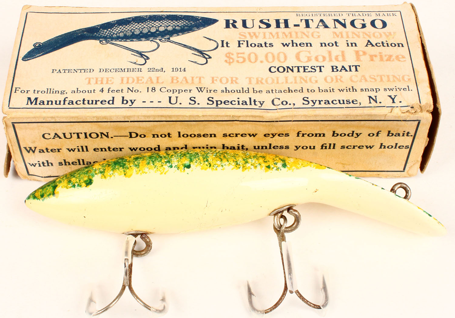 Rush-Tango Minnow in the original box, no eyes, green & yellow back with cream belly, 2 hooks, near mint other than some paint loss to rear of belly, box has taped together end flaps. Grade: Excellent - Value: 20 to 100