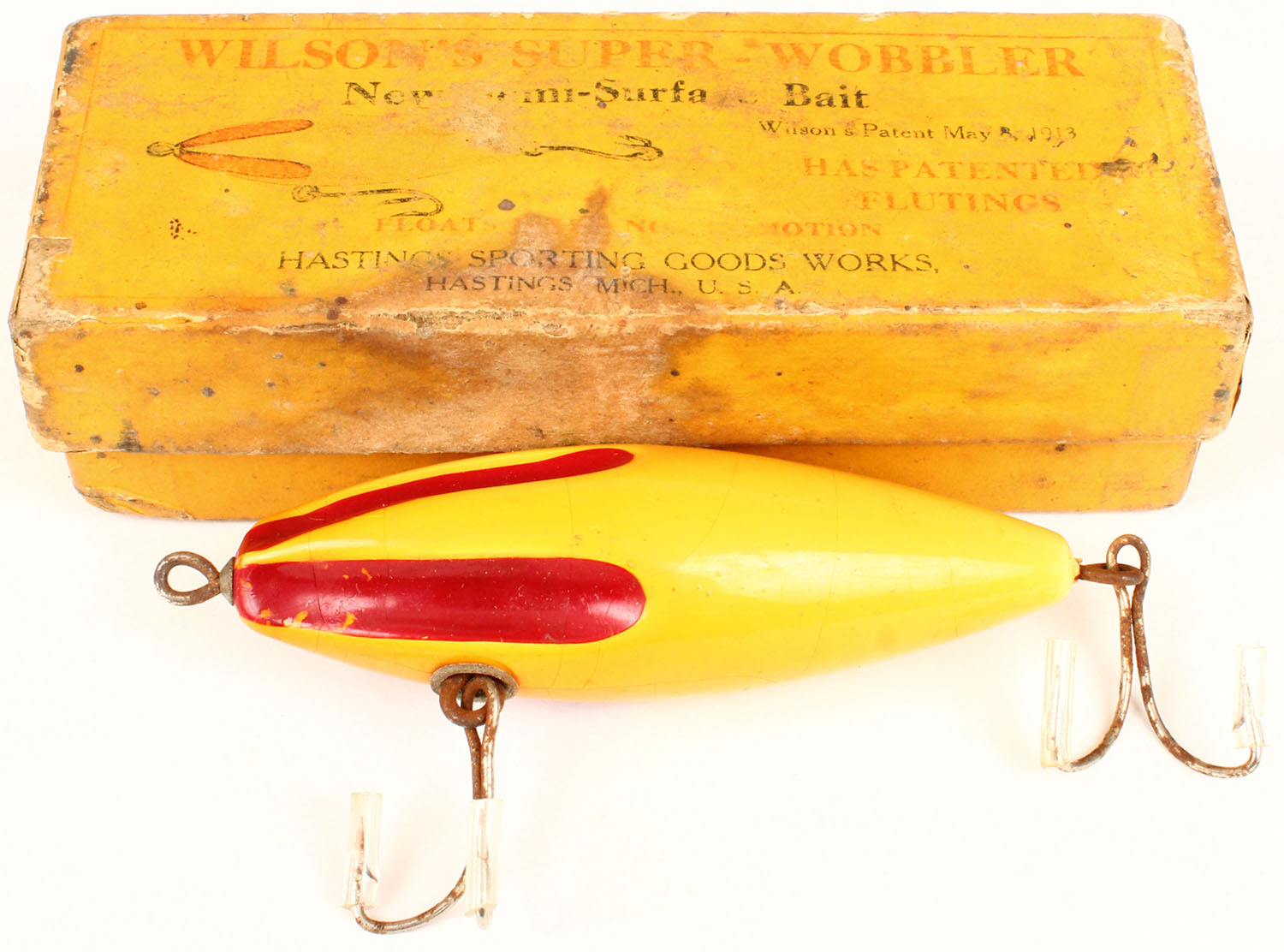 Rare Wilson Super Wobbler in original box, 1913, yellow & red which maybe a rare color?, 2 hooks with only 2 barbs each, lure is near mint & box shows age soiling. Grade: Excellent + - Value: 40 to 150