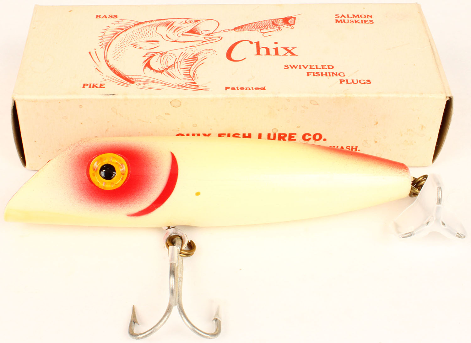 Chix Salmon Plug in original box, 6''. Grade: MINT - Value: 10 to 40