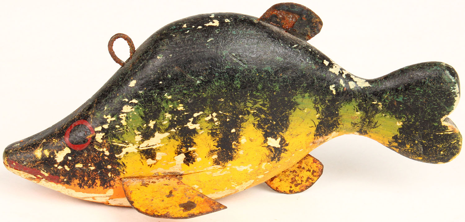 Unmarked Ice Fishing Sunfish Decoy, PE, 1 line ties, has 4 metal fins, 4'' OAL. Grade: Excellent - Value: 10 to 40