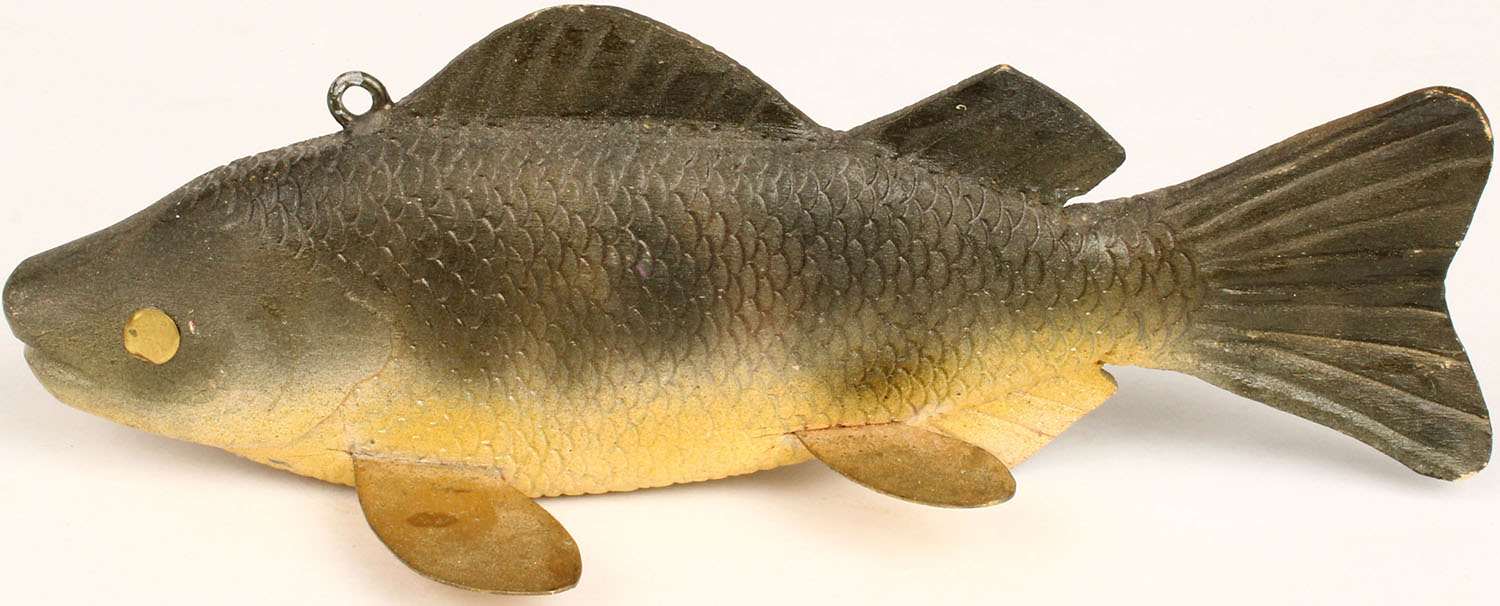 Unmarked Ice Fishing Decoy, TE, has 4 metal fins, 7 1/2 '' OAL. Grade: MINT - Value: 10 to 50