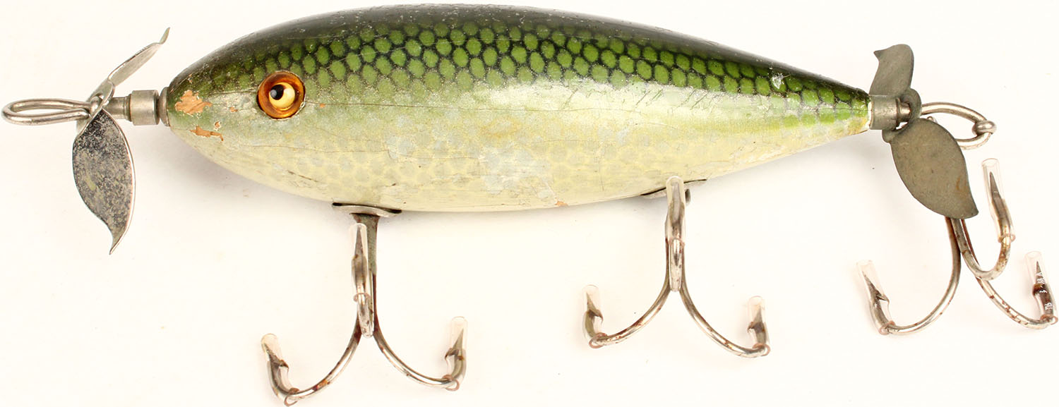 Unmarked Surf Oreno?, green scale, GE, wood lure, 3 hooks. Grade: Excellent - Value: 20 to 150