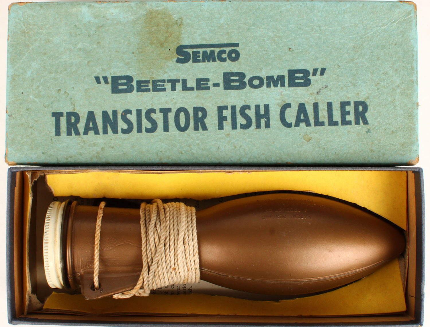 Southwest Engr. & MFG Co. ''BEETLE-BOMB'' Transistor fish caller in original box with paperwork, 8'', this is suppose to transmit a signal under your boat to attract fish. Grade: Excellent - Value: 6 to 30